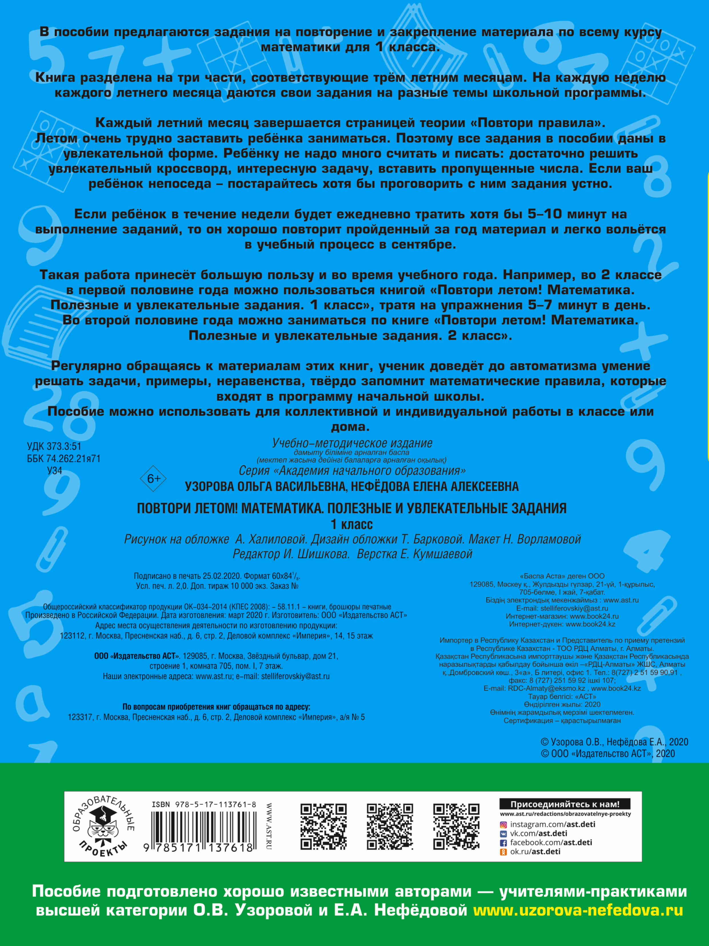 В пособии предлагаются задания на повторение и закрепление материала по всему курсу математики для 1 класса. Книга разделена на три части, соответствующие трём летним месяцам. На каждую неделю каждого летнего месяца даются свои задания на разные темы школьной программы. Каждый летний месяц завершается страницей теории «Повтори правила». Летом очень трудно заставить ребёнка заниматься. Поэтому все задания в пособии даны в увлекательной форме. Ребёнку не надо много писать: достаточно решить увлекательный кроссворд, занимательную задачу, вставить цифру или знак. Если ваш ребёнок непоседа - постарайтесь хотя бы проговорить с ним задания устно. Если ребёнок в течение недели будет ежедневно тратить хотя бы 5-10 минут в день на выполнение заданий, то он хорошо повторит пройденный за год материал и легко вольётся в учебный процесс в сентябре. Такая работа принесёт большую пользу и во время учебного года. Например, во 2 классе в первой половине года можно пользоваться книгой «Повтори летом! Математика. Полезные и увлекательные задания. 1 класс», тратя на упражнения 5-7 минут в день. Во второй половине года можно заниматься по книге «Повтори летом! Математика. Полезные и увлекательные задания. 2 класс». Регулярно обращаясь к материалам этих книг, ученик доведёт до автоматизма умение решать задачи, примеры, неравенства, твёрдо запомнит математические правила, которые входят в программу начальной школы. Пособие можно использовать для коллективной и индивидуальной работы в классе или дома.| Издательство | Издательство "АСТ" |