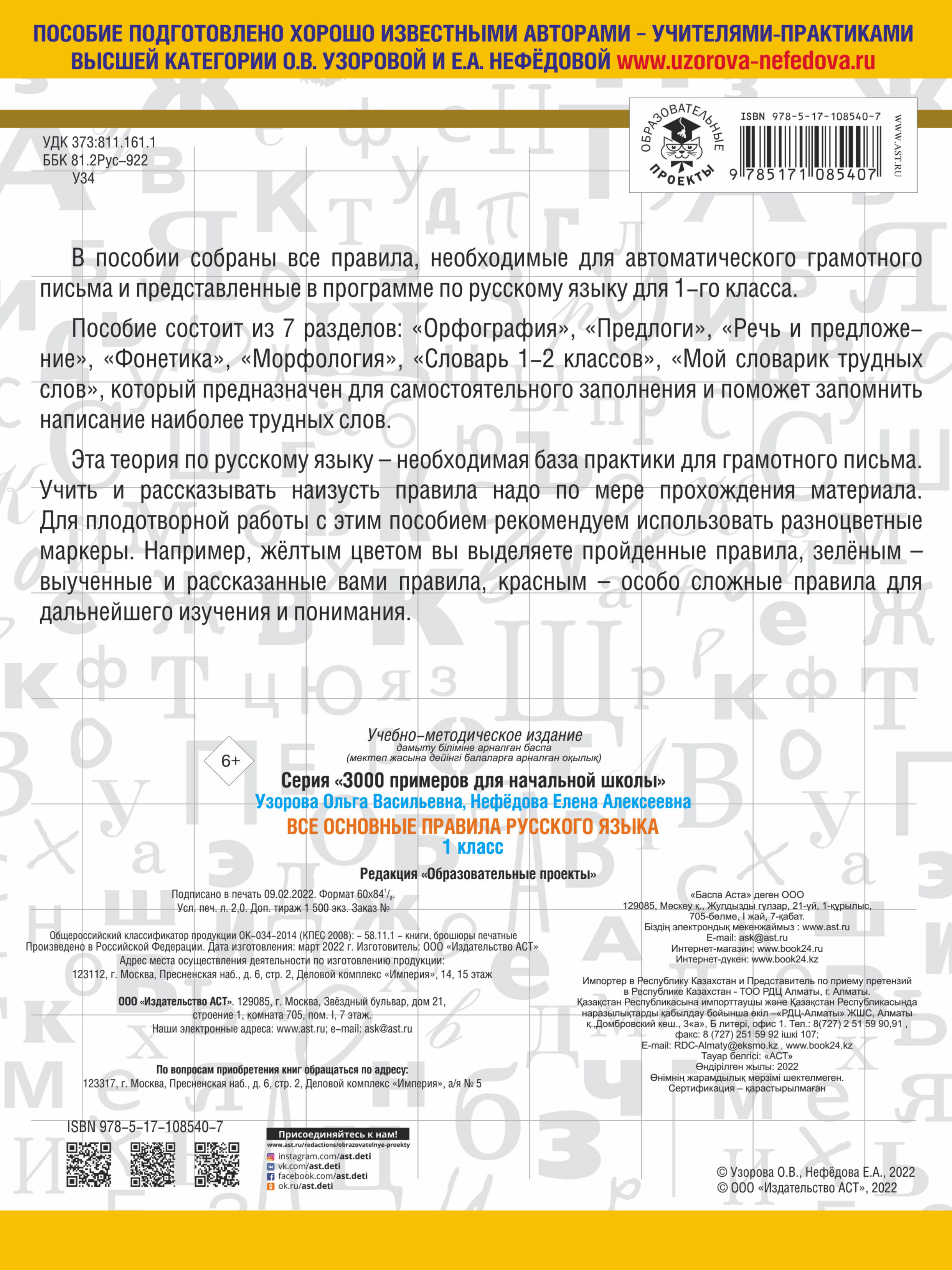 В пособии собраны все правила, необходимые для автоматического грамотного письма. Без знания этой теории невозможно написать без ошибок различные проверочные работы. В пособие вошли основные правила, представленные во всех федеральных учебниках по русскому языку для 1-го класса.| Издательство | Издательство "АСТ" |