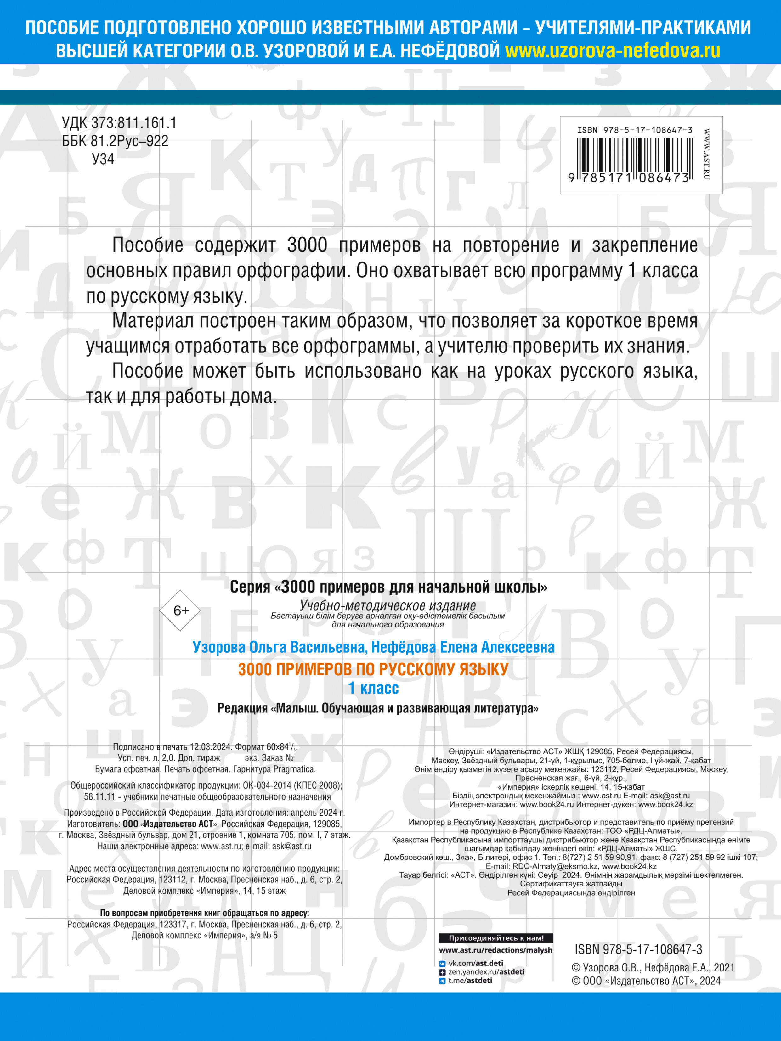 Аннотация: 3000 примеров по русскому языку. 1 класс