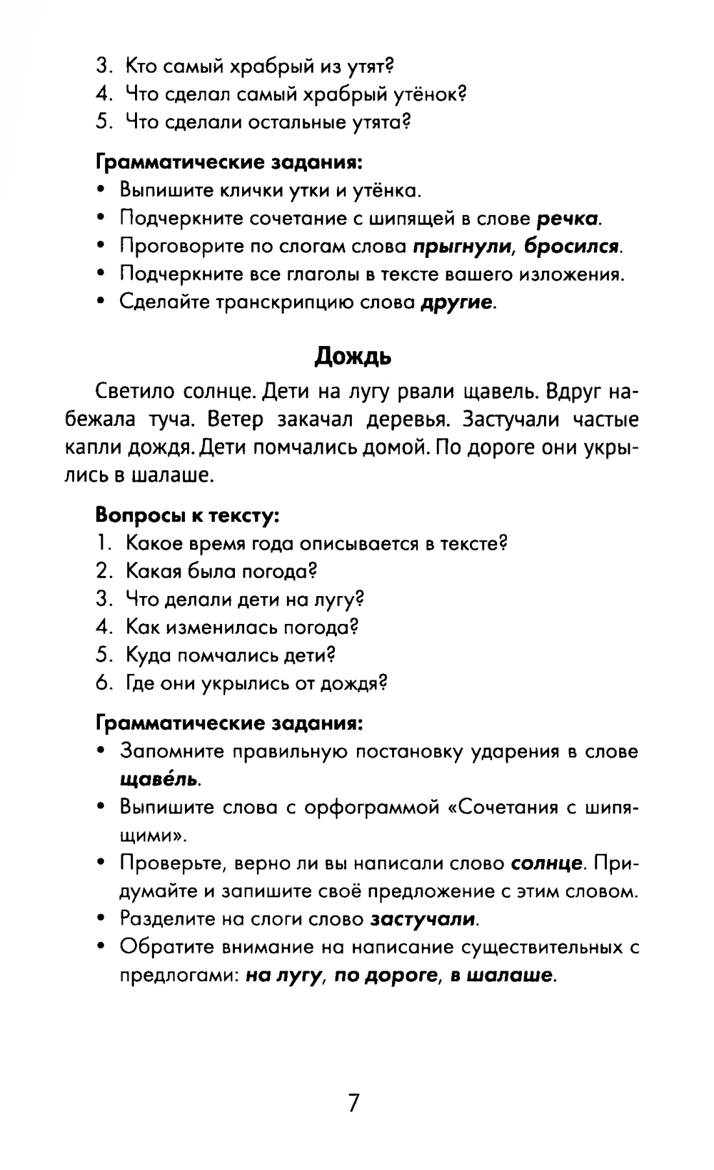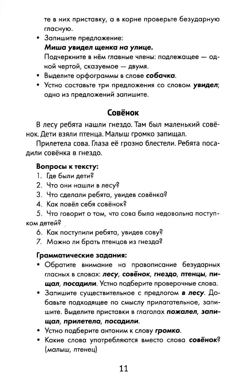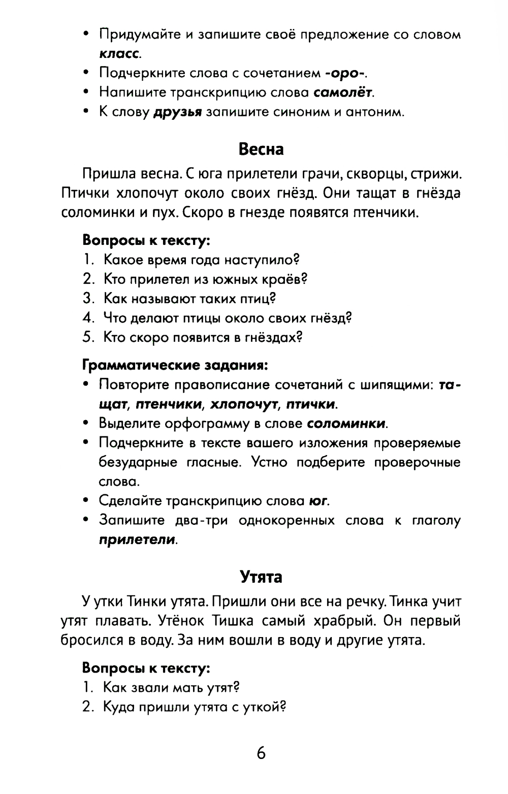 Тексты и задания в пособии составлены таким образом, чтобы учащиеся могли повторить и закрепить изучаемый на уроках материал: фонетический и морфемный состав слова, орфограммы и словарные слова, синонимы и антонимы, начальные сведения о частях речи и членах предложения. Каждый текст снабжён пятью заданиями по программному материалу с акцентом на грамматику. К первым двадцати текстам приводятся вопросы, которые помогут первокласснику написать изложение.
