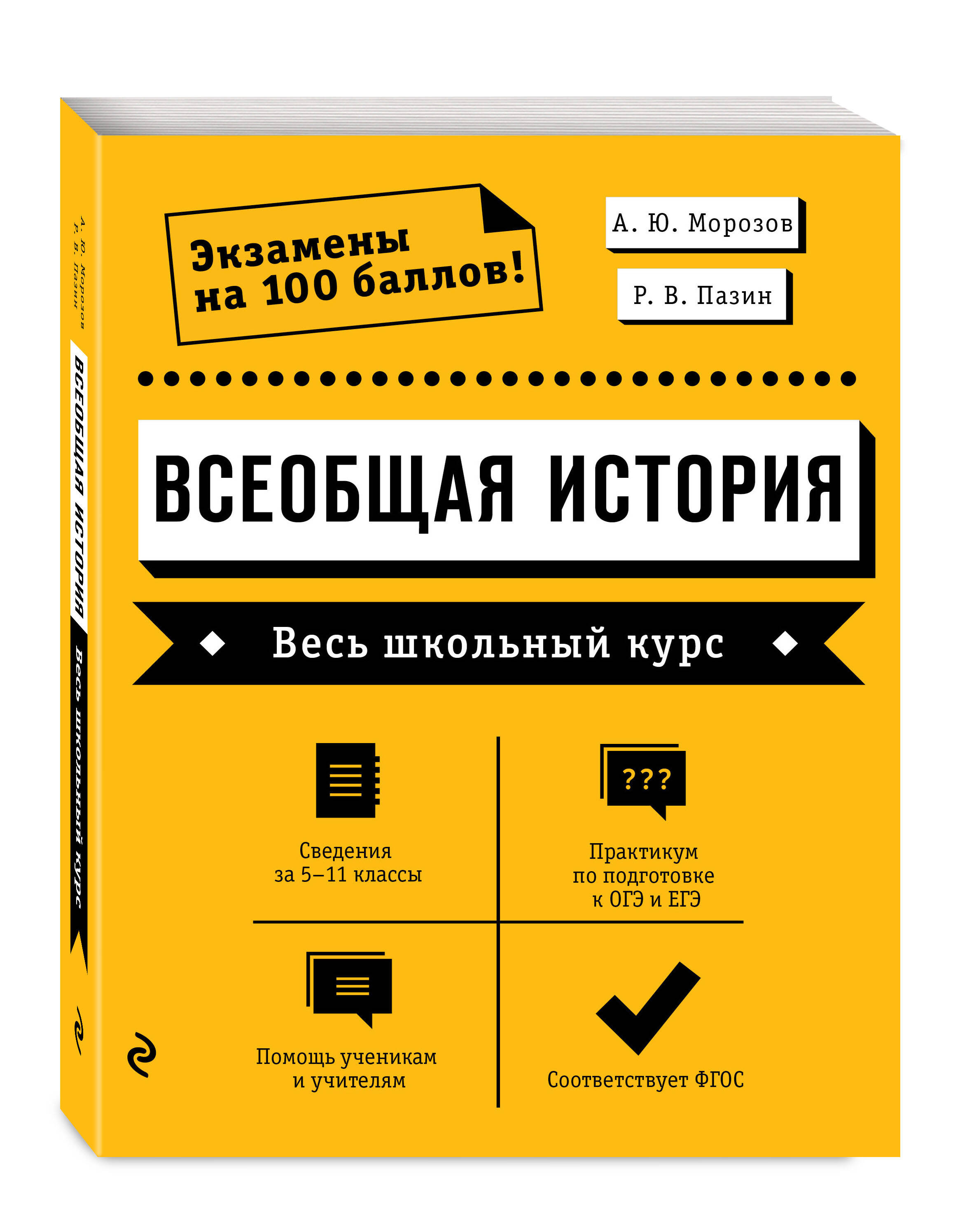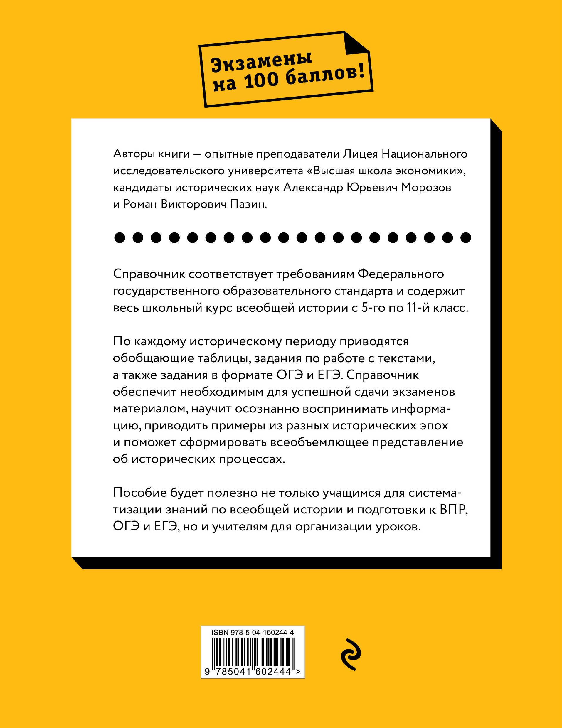 Справочник, соответствующий требованиям ФГОС, содержит сведения по всему школьному курсу всеобщей истории с 5-го по 11-й класс. Приводятся обобщающие таблицы по историческим периодам, задания с текстами, практикум по подготовке к ОГЭ и ЕГЭ. Пособие адресовано учащимся для подготовки к выпускным экзаменам, учителям для организации уроков, а также всем, кто интересуется всеобщей историей. Знание истории зарубежных стран с каждым годом все в большем объеме проверяется на ОГЭ, ЕГЭ и ВПР, однако на повторение этого материала на уроках зачастую не хватает времени. Данное пособие помогает решить эту проблему - в нем приводится школьный курс всеобщей истории, начиная с Древнего мира и заканчивая Новейшей историей. Справочник обеспечит учащихся необходимым для успешной сдачи экзаменов материалом, научит осознанному восприятию информации, поможет сформировать всеобъемлющее представление об исторических процессах. Кроме того, знания и навыки, которые формирует пособие, пригодятся и при выполнении заданий по истории России, а также будут способствовать пониманию общемирового исторического контекста. Книга написана опытными преподавателями Лицея Национального исследовательского университета «Высшая школа экономики», кандидатами исторических наук А.Ю. Морозовым и Р.В. Пазиным.| Издательство | Эксмо |