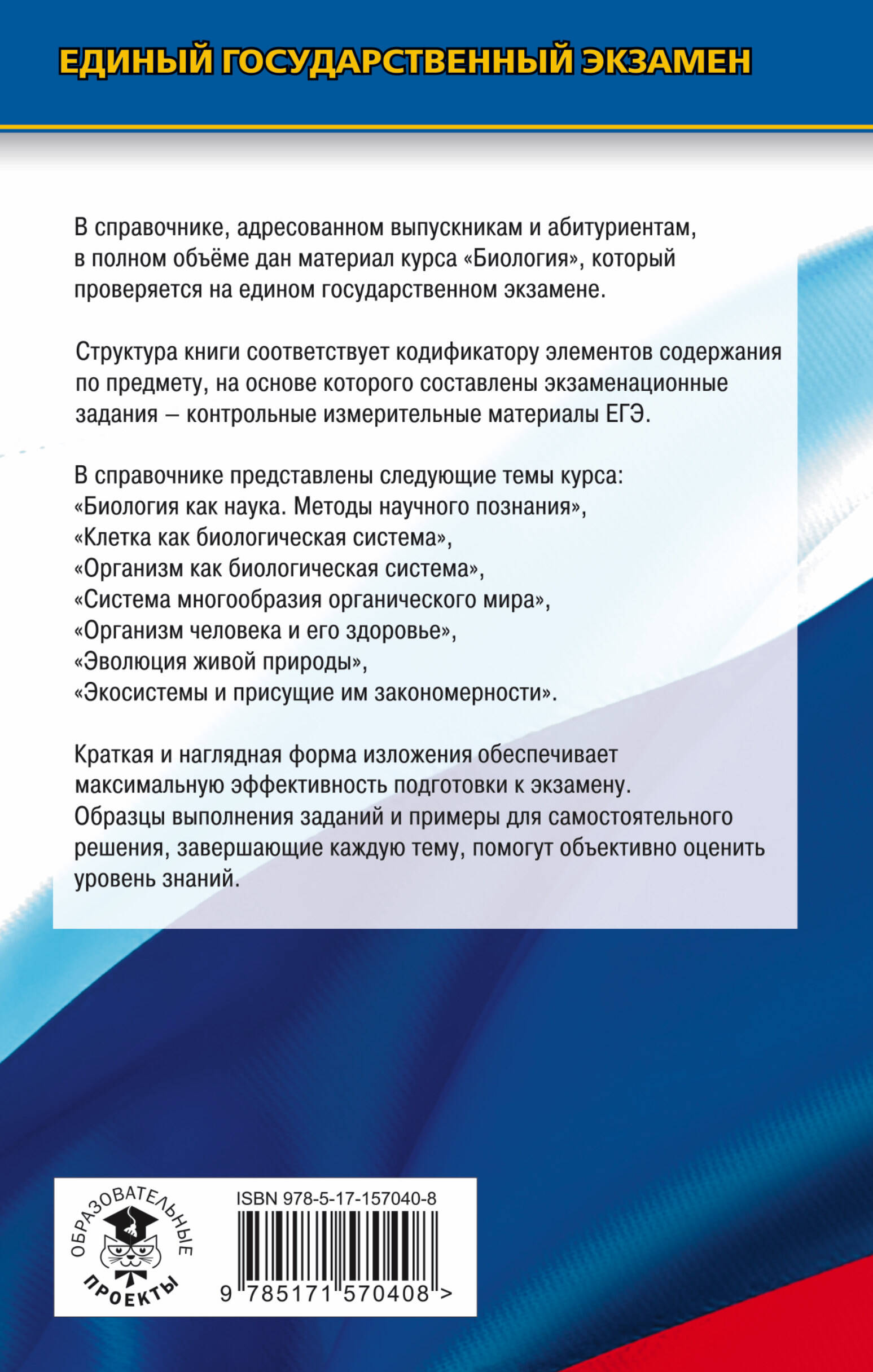 Данный справочник содержит весь теоретический материал по курсу биологии, необходимый для сдачи ЕГЭ. Он включает в себя все элементы содержания, проверяемые контрольно-измерительными материалами, и помогает обобщить и систематизировать знания и умения за курс средней (полной) школы. Теоретический материал изложен в краткой, доступной форме. Каждый раздел сопровождается примерами тестовых заданий, позволяющими проверить свои знания и степень подготовленности к аттестационному экзамену. Практические задания соответствуют формату ЕГЭ. В конце пособия приводятся ответы к тестам, которые помогут школьникам и абитуриентам проверить себя и восполнить имеющиеся пробелы.| Издательство | ИЗДАТЕЛЬСТВО "АСТ" |