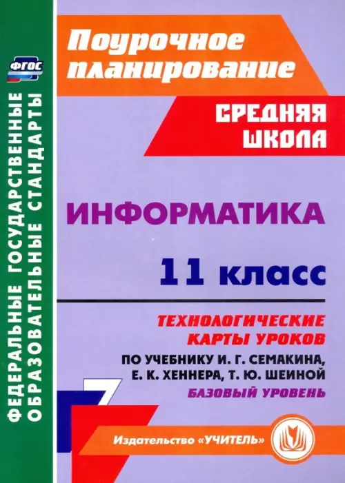 В пособии представлены технологические карты уроков по информатике, составленные на основе ФГОС среднего общего образования, Примерной программы по информатике для 11 классов и ориентированные на работу с учебником И.Г. Семакина, Е.К. Хеннера, Т.Ю. Шеиной (М.: БИНОМ. Лаборатория знаний). Предложенные разработки позволят творчески работающему учителю выстроить урок с использованием проблемных, поисковых и практических методов, отразить тот или иной инновационный педагогический подход в преподавании информатики; помогут определить объем усвоения учебного материала, уровень владения компетенциями и сформированности универсальных учебных действий. Предназначено учителям, руководителям МО информатики; рекомендовано студентам педагогических учебных заведений.