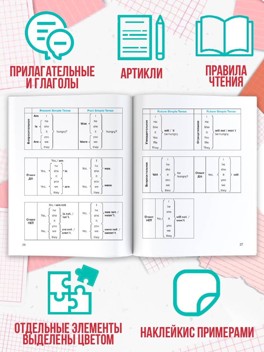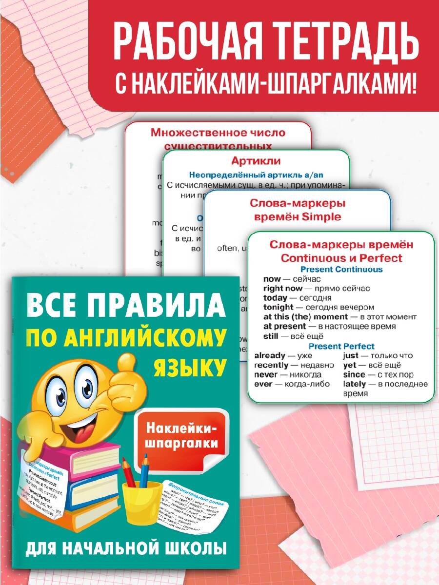 «Все правила по английскому языку» - это справочное пособие для учеников 1−4 классов. В книге в простой и наглядной форме представлен материал по английскому языку, изучаемый в начальной школе. На страницах пособия ребёнок найдёт правила чтения буквосочетаний, образования степеней сравнения прилагательных, второй и третьей форм глагола, употребления артиклей, глагола to be, модальных глаголов. Отдельные элементы текста в пособии выделены цветом - это облегчает запоминание информации, повышает эффективность учебного процесса. Запомнить учебный материал ребёнку помогут цветные наклейки-шпаргалки с наиболее важными правилами. Стикерами можно украсить обложку учебника или тетради - таким образом, подсказка всегда будут перед глазами учащегося.| Издательство | Издательство "АСТ" |