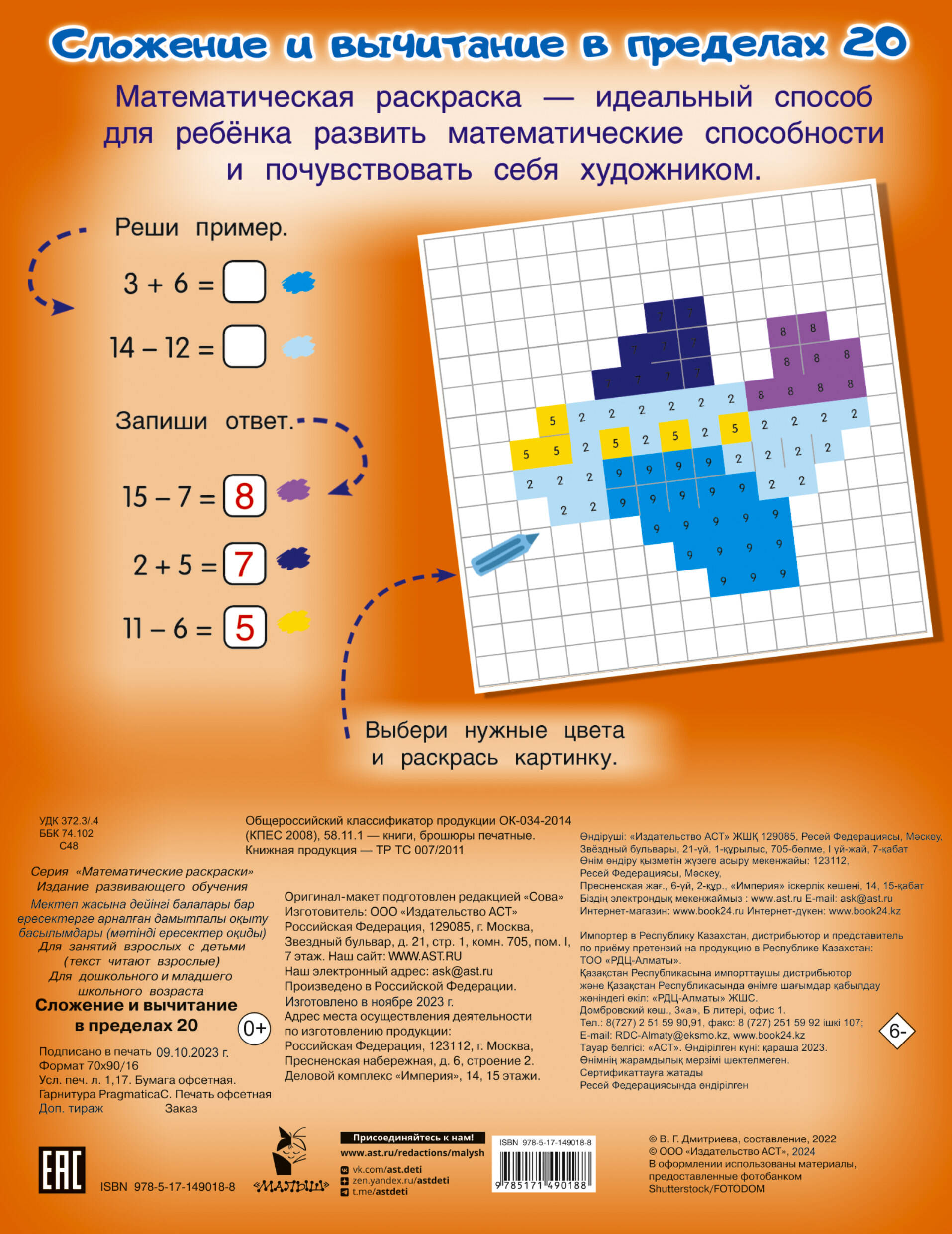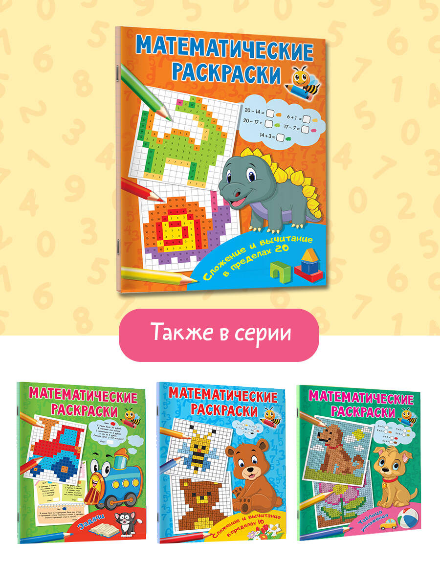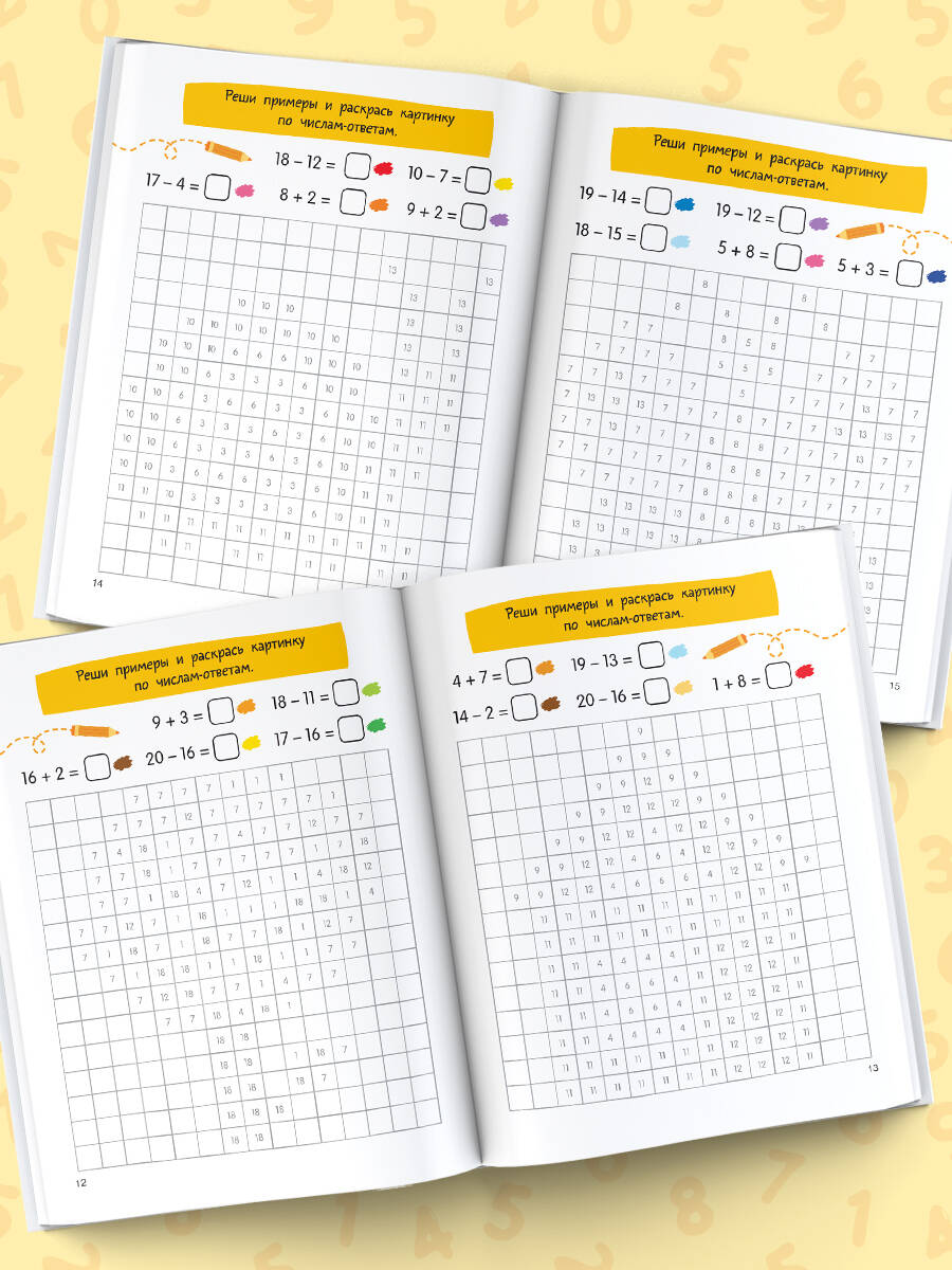 «Сложение и вычитание в пределах 20» - это одновременно и сборник примеров по математике для учеников младших классов, и замечательная книжка-раскраска. Решая примеры и раскрашивая клеточки по числам-ответам, ребёнок будет создавать красочные картинки.| Издательство | ИЗДАТЕЛЬСТВО "АСТ" |