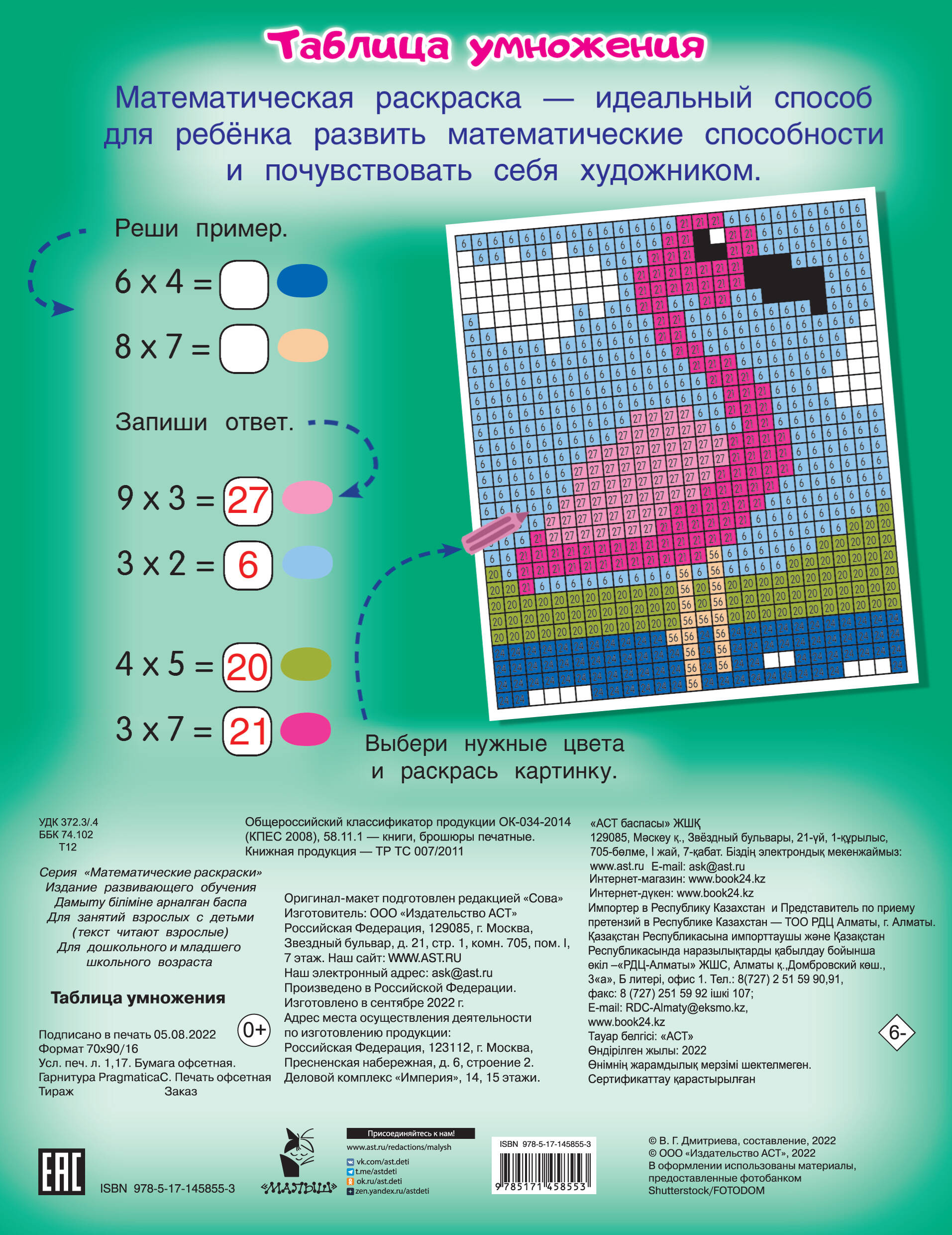 Развивающая книжка «Таблица умножения» - это одновременно и сборник примеров на умножение для учеников младших классов, и замечательная раскраска. Выполняя задания и раскрашивая клеточки по числам-ответам, ребёнок будет создавать красочные картинки.| Издательство | ИЗДАТЕЛЬСТВО "АСТ" |
