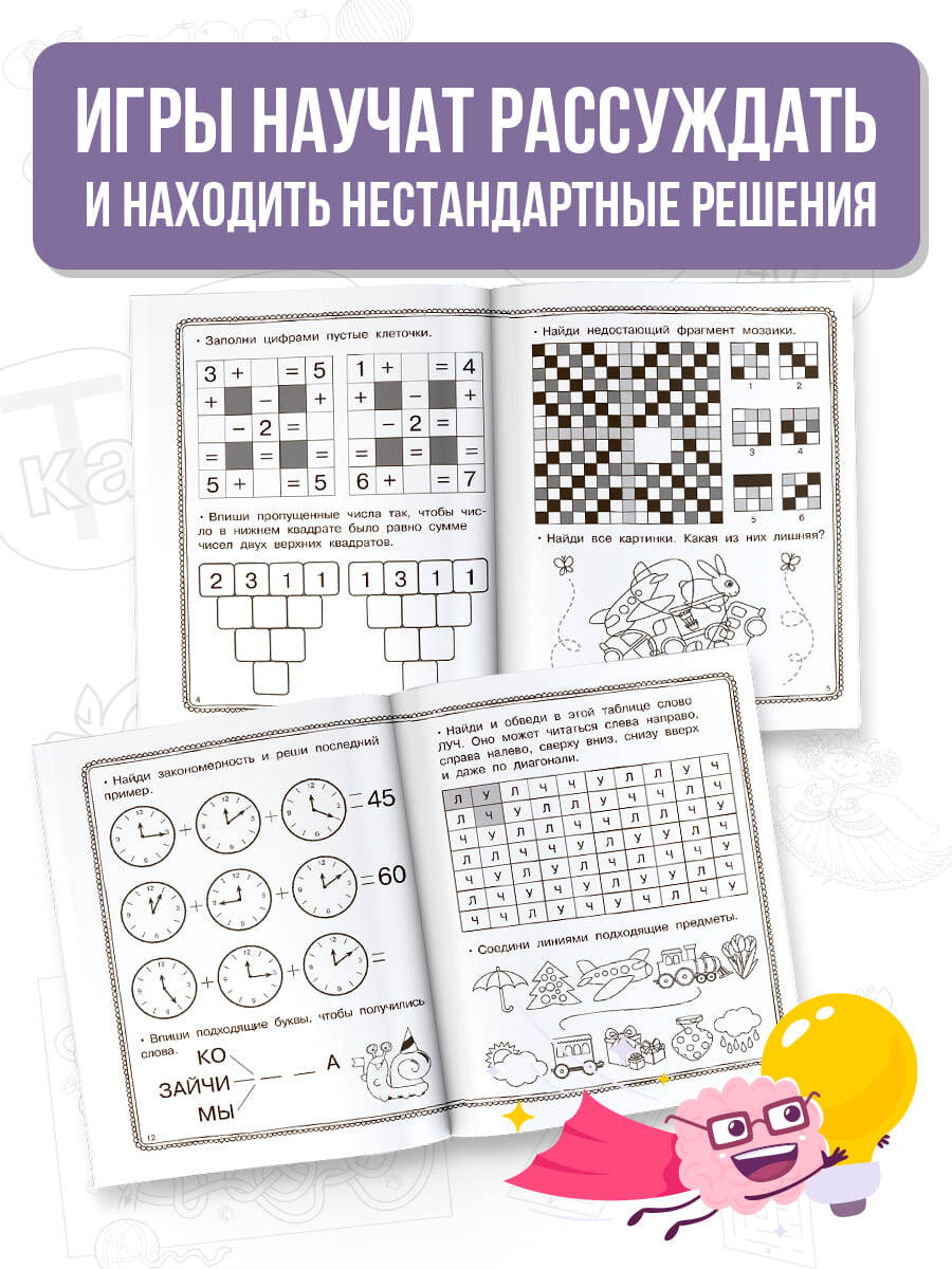 Хотите, чтобы ребёнок развивал интеллект, логику, память и внимание? Чтобы в нём проснулось желание заниматься? Тогда вам идеально подойдёт книга «Упражнения на сообразительноcть». В книге собраны разные интересные задания. В простой и интересной форме ребёнок сможет потренировать сообразительность и логические навыки и проявить смекалку. Главная задача сборника - научить ребёнка думать, рассуждать, находить нестандартные решения. Занятия с книжкой не превратятся в унылые уроки в школе. Вместе с забавными героями ребёнок поиграет, решит интересные кроссворды и головоломки. А весёлая, игровая форма заданий не позволит юному ученику заскучать.| Издательство | ИЗДАТЕЛЬСТВО "АСТ" |