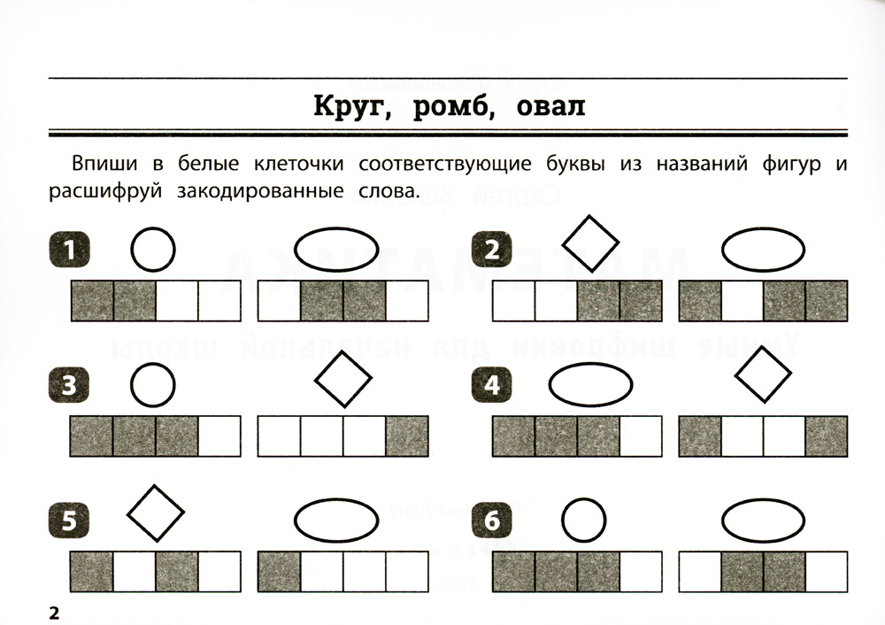 В сборнике представлены разнообразные виды математических шифровок. Задания помогут ученикам 2-3 классов повторить названия геометрических фигур, запомнить табличные случаи умножения на 1, 2, 3, закрепить навык устного счёта при решении примеров на сложение и вычитание. Пособие адресовано ученикам 2-3 классов и их родителям, а также педагогам начальной школы.