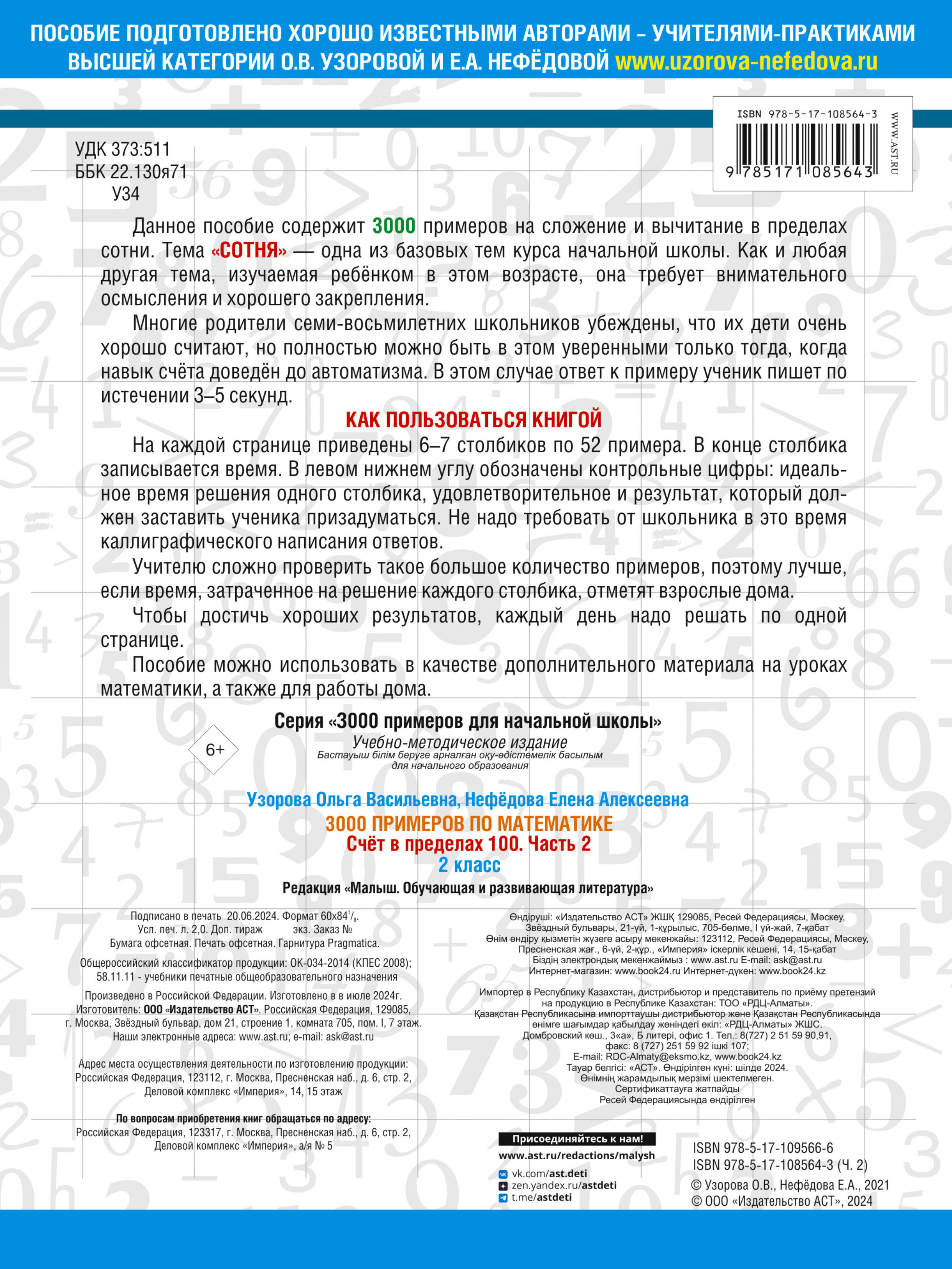 Данное пособие содержит 3000 примеров на сложение и вычитание в пределах сотни. Тема «Сотня» - одна из базовых тем курса начальной школы. Как и любая другая тема, изучаемая ребенком в этом возрасте, она требует внимательного осмысления и хорошего закрепления. Многие родители семи-восьмилетних школьников убеждены, что их дети очень хорошо считают, но полностью можно быть в этом уверенными только тогда, когда навык счета доведен до автоматизма. В этом случае ответ к примеру ученик пишет по истечении 4 - 7 секунд. Как пользоваться книгой На каждой странице расположены 6 - 7 столбиков по 52 примера. В конце столбика записывается время. В левом нижнем углу обозначены контрольные цифры: идеальное время решения одного столбика, удовлетворительное и результат, который должен заставить ученика призадуматься. Не надо требовать от школьника в это время каллиграфического написания ответов. Учителю сложно проверить такое большое количество примеров, поэтому лучше, если время, затраченное на решение каждого столбика, отметят взрослые дома. Чтобы достичь хороших результатов, каждый день надо решать по одной странице. Пособие можно использовать в качестве дополнительного материала на уроках математики, а также для работы дома.