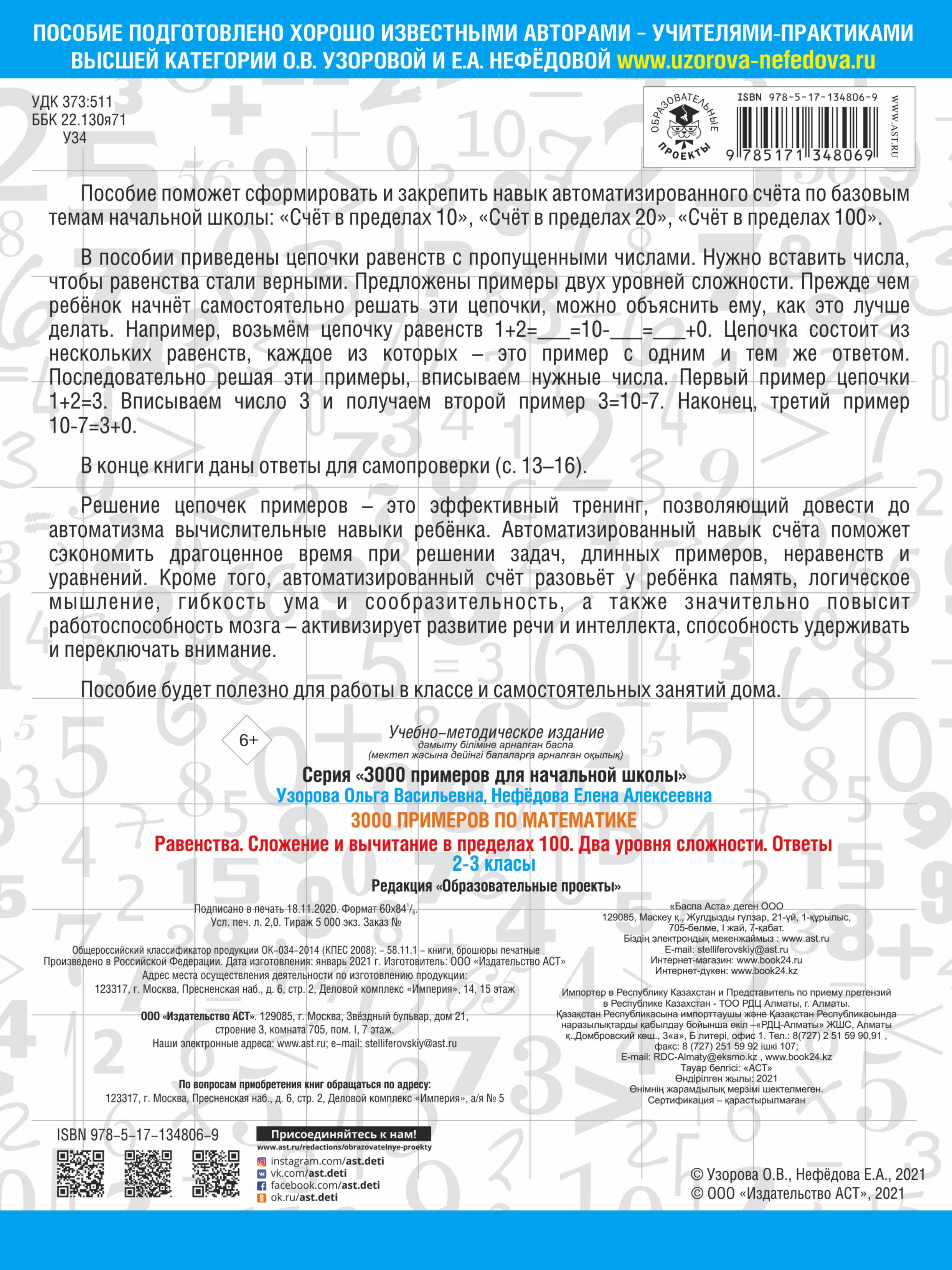 Аннотация: 3000 примеров по математике. Равенства. Сложение и вычитание в пределах 100. Два уровня сложности. Ответы. 2-3 классы