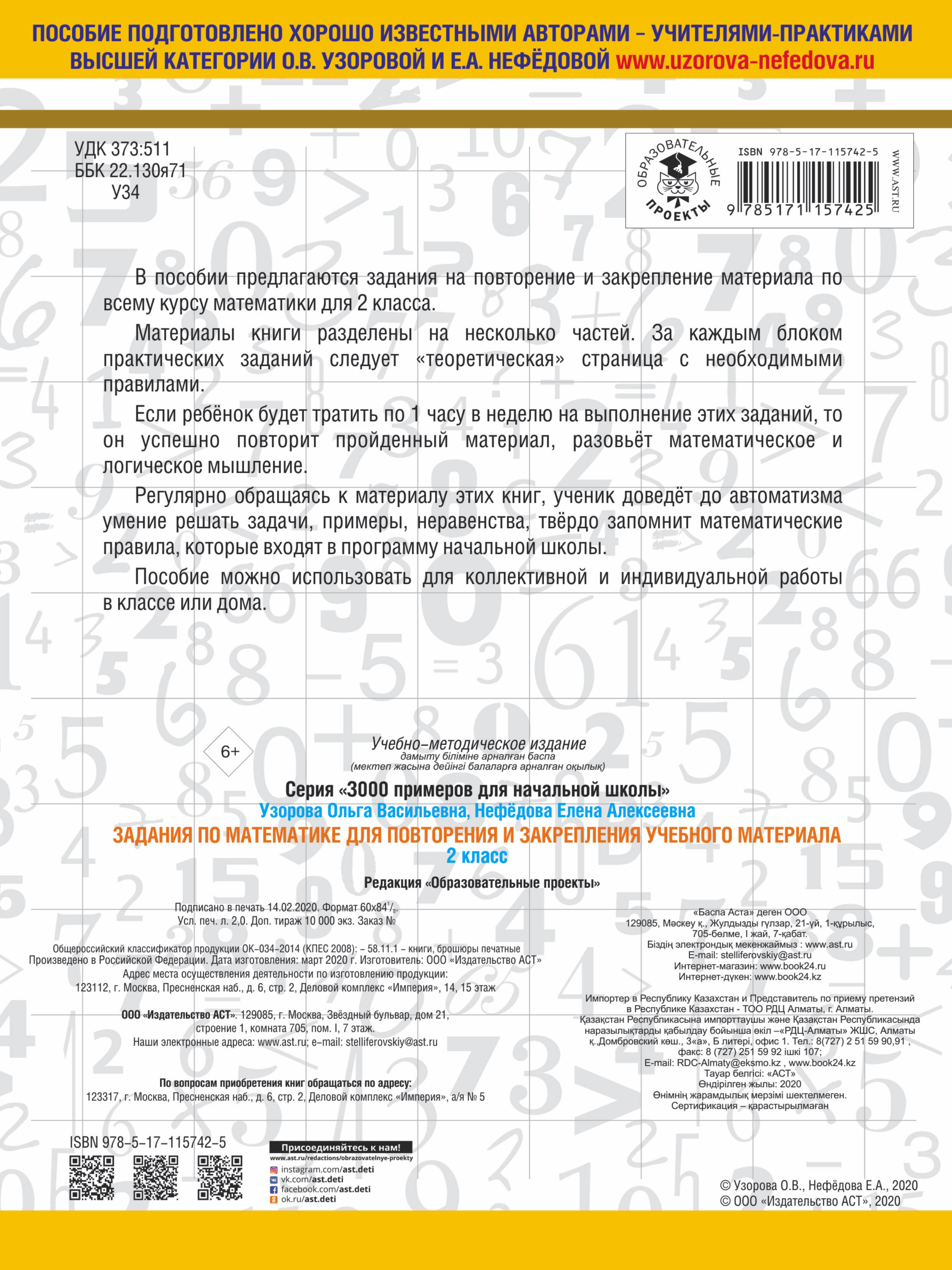 В пособии известных педагогов-практиков, авторов самых издаваемых учебников и учебных пособий в России О.В. Узоровой и Е.А. Нефёдовой предлагаются задания на повторение и закрепление материала по всему курсу математики для 2 класса. За каждым блоком практических заданий следует страница с необходимыми правилами. Регулярно занимаясь по этому пособию, ученик доведёт до автоматизма умение решать задачи, примеры, неравенства, твёрдо запомнит математические правила, которые входят в программу начальной школы. Пособие можно использовать для коллективной и индивидуальной работы в классе или дома.| Издательство | ИЗДАТЕЛЬСТВО "АСТ" |