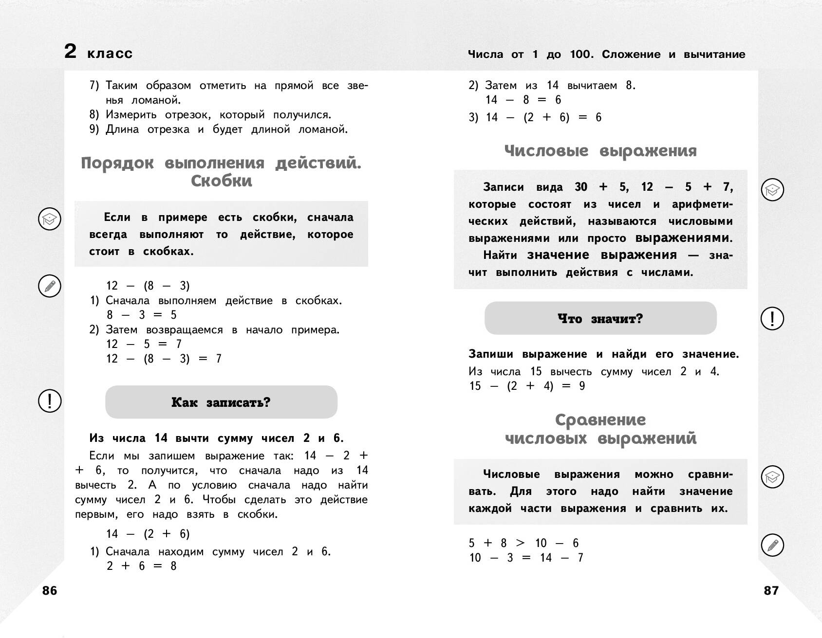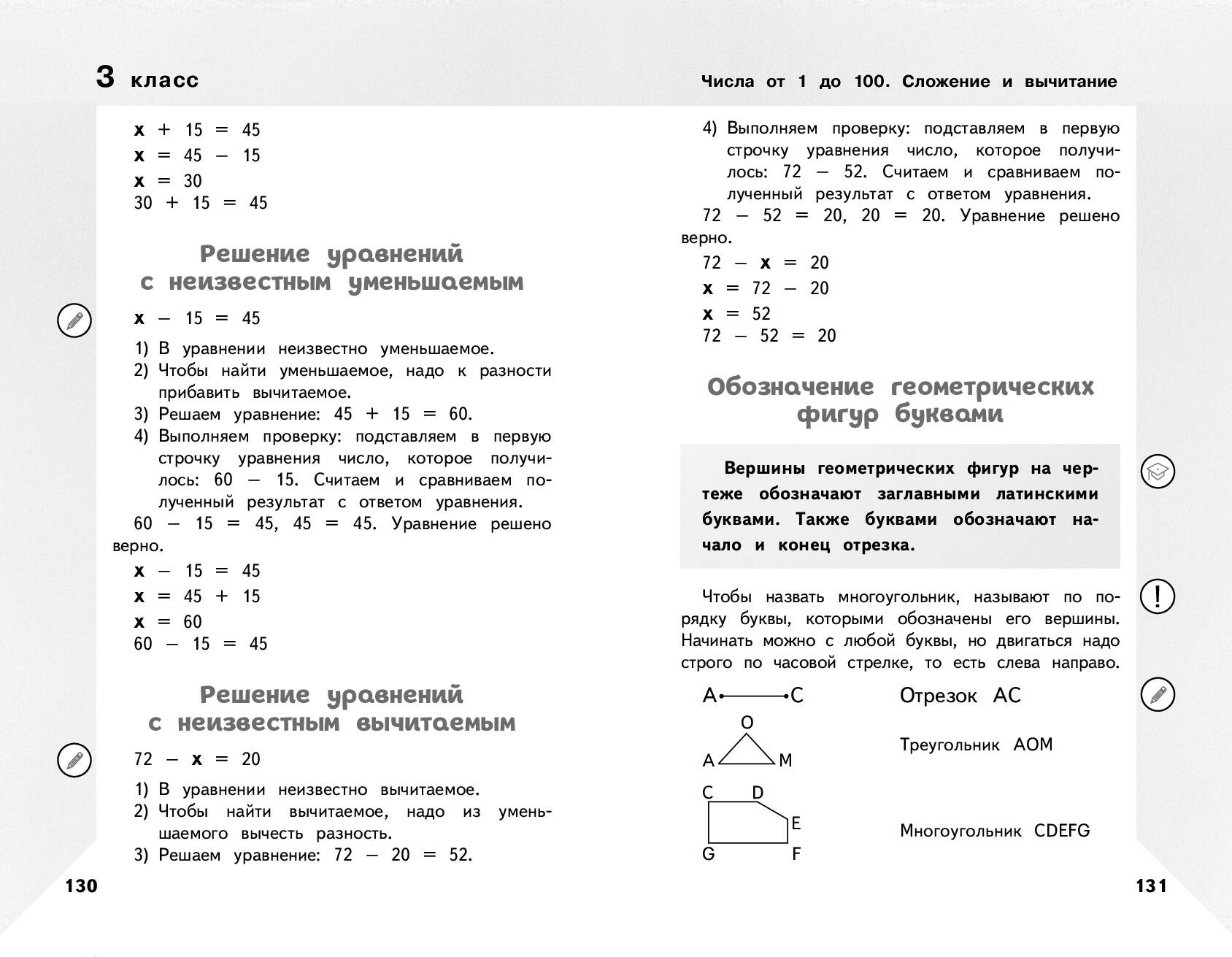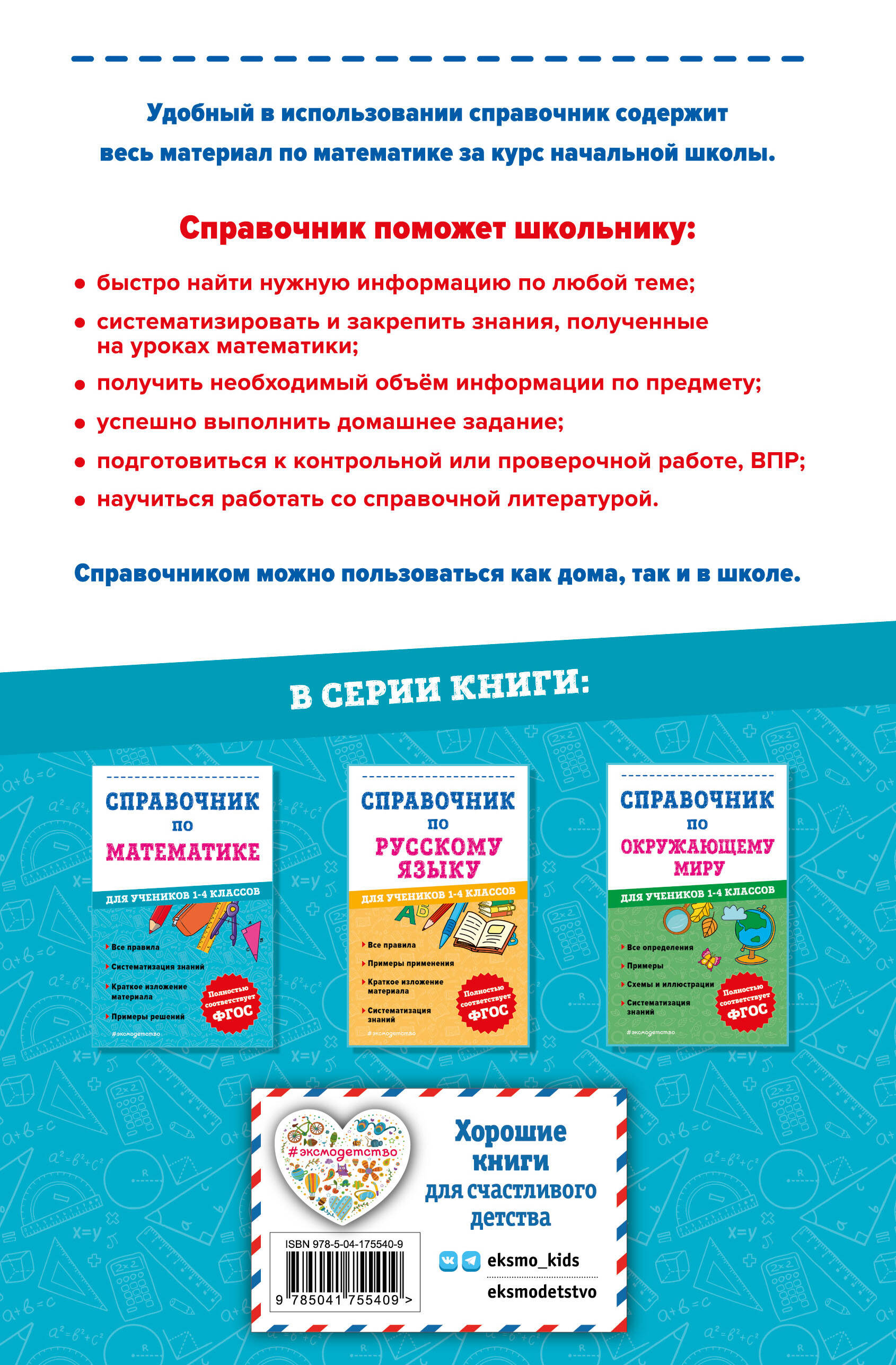 Современный справочник для учеников начальной школы прост и функционален. Весь материал по математике 1-4 классов представлен в виде таблиц, схем, правил и примеров. Темы следуют друг за другом в том же порядке, что и в школьных учебниках. Правила и определения даны кратко и понятно, что облегчает запоминание. Пособие разработано в полном соответствии с требованиями ФГОС начального общего образования. Результатом работы со справочником станут: • систематизация и надёжное закрепление знаний; • умение применять полученные знания на практике; • навык работы со справочной литературой; • высокий результат на ВПР.