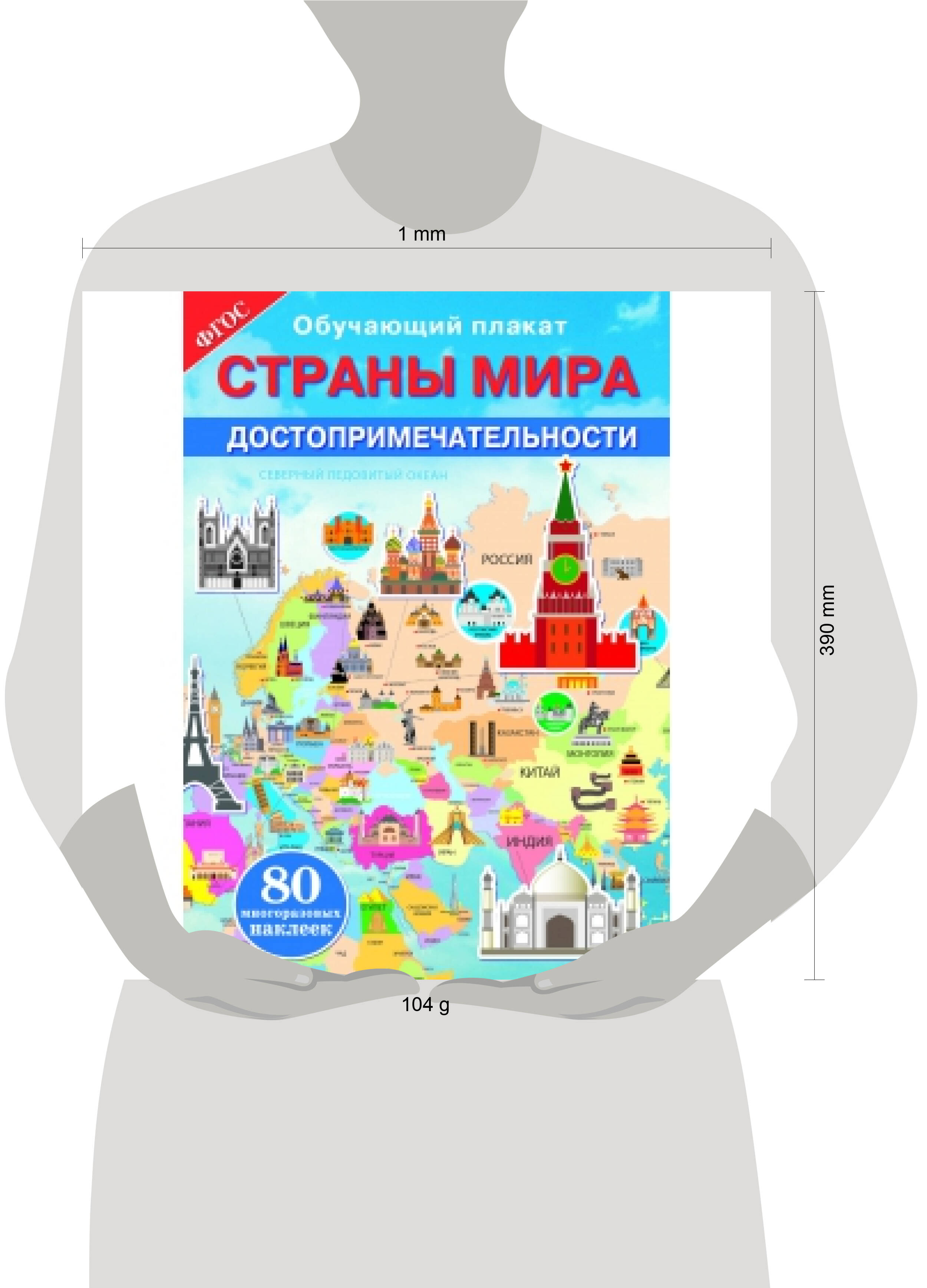 Благодаря этому плакату ты сможешь отправиться в увлекательное и познавательное путешествие по всему миру, не выходя из дома. Найди на листах с наклейками изображения памятников, архитектурных сооружений и других достопримечательностей и наклей их на плакат. Справочная информация на обороте плаката содержит краткие сведения о каждом объекте. Она поможет открыть для себя и правильно разместить на плакате те достопримечательности, которые тебе пока малоизвестны. Приятного путешествия!| Издательство | Стрекоза Торговый дом ООО |
