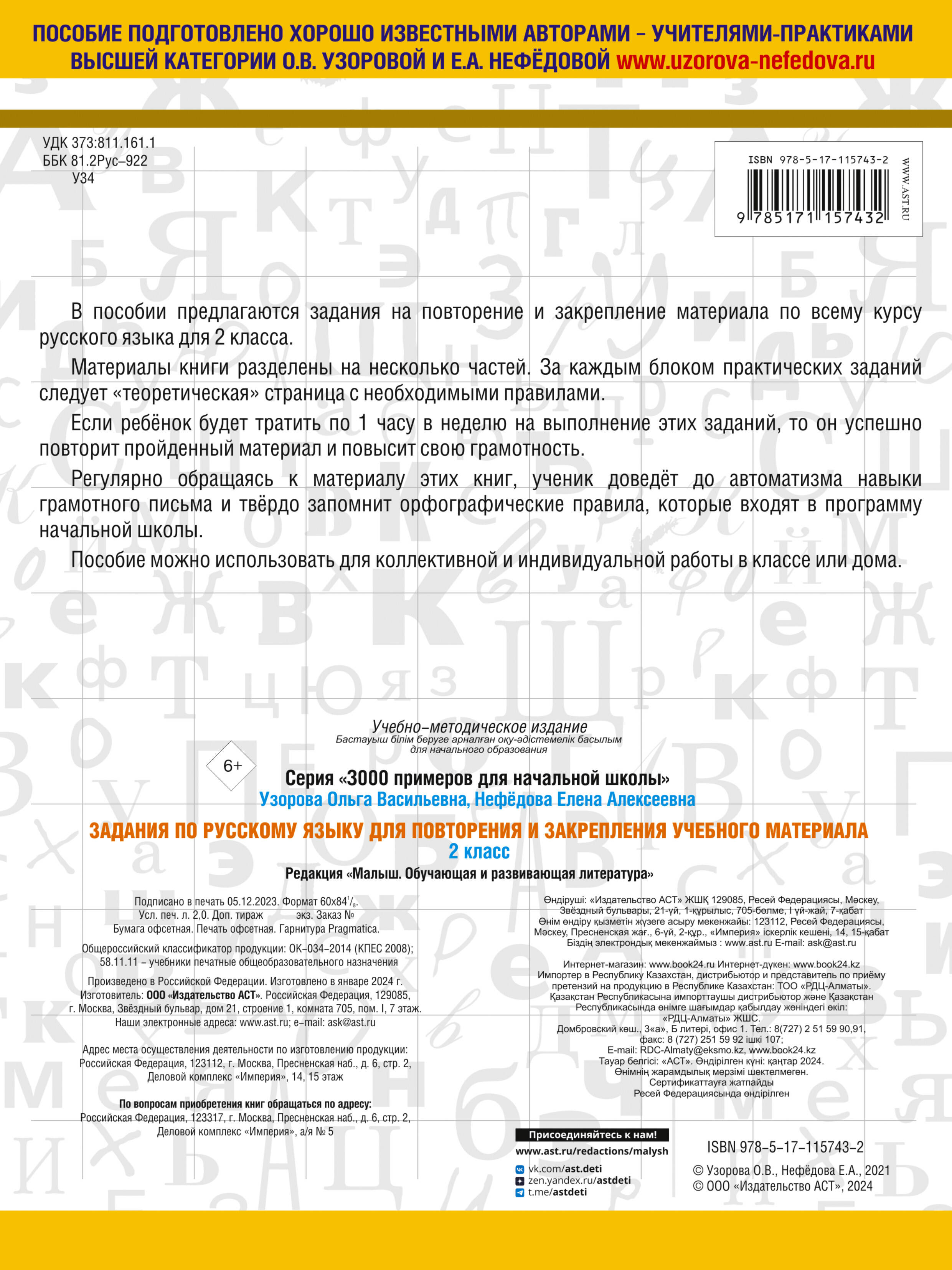 В пособии предлагаются задания на повторение и закрепление материала по всему курсу русского языка для 2 класса. Материалы книги разделены на несколько частей. За каждым блоком практических заданий следует «теоретическая» страница с необходимыми правилами. В конце книги даны словарные слова. Если ребёнок будет тратить по 1 часу в неделю на выполнение этих заданий, то он успешно повторит пройденный материал и повысит свою грамотность. Регулярно обращаясь к материалу этих книг, ученик доведет до автоматизма навыки грамотного письма и твердо запомнит орфографические правила, которые входят в программу начальной школы. Пособие можно использовать для коллективной и индивидуальной работы в классе или дома.| Издательство | Издательство "АСТ" |