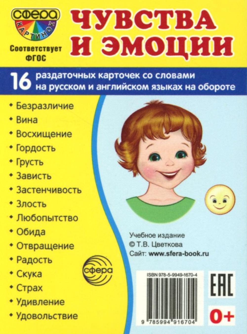 16 раздаточных карточек размером 63х87 мм для познавательного и речевого развития. На обороте каждой карточки - название чувств и эмоций на русском и английском языках. Состав комплекта: Положительные: восхищение, гордость, радость, удовольствие. Отрицательные: вина, грусть, зависть, злость, обила, отвращение, страх. Нейтральные или смешанные: безразличие, застенчивость, любопытство, скука, удивление.| Издательство | Творческий центр Сфера |