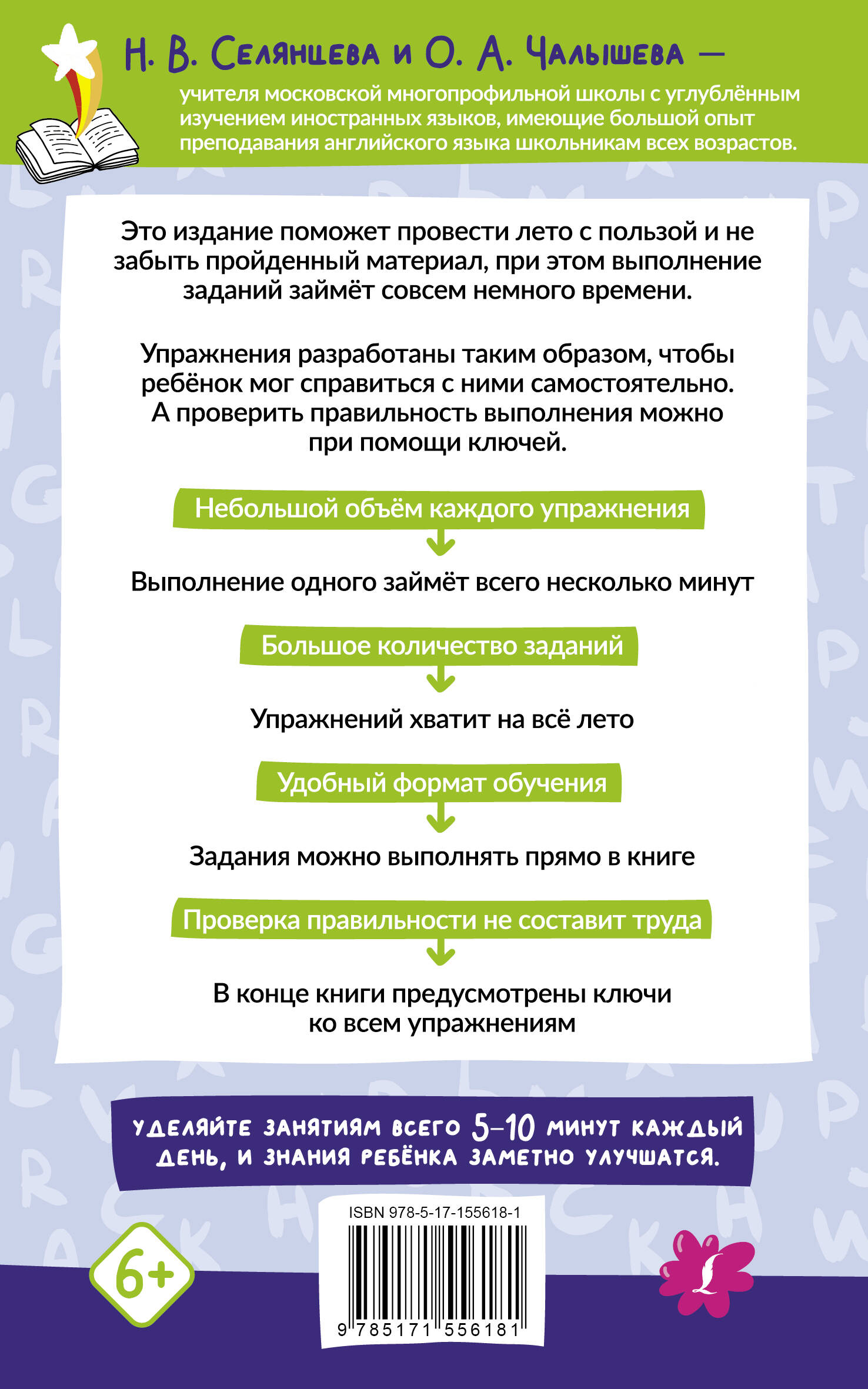 Наталья Валерьевна Селянцева - учитель английского языка высшей аттестационной категории, аккредитованный эксперт ЕГЭ, автор пособий для школьников. Ольга Александровна Чалышева - учитель английского языка первой аттестационной категории с многолетним опытом преподавания в школе, использующая на практике современные методики обучения. В этом пособии представлены задания, соответствующие общеобразовательной программе начальной школы по английскому языку. Все упражнения в книге небольшие по объему, это позволит каждому индивидуально подобрать нагрузку и сочетать ее с отдыхом во время летних каникул. Важно заниматься регулярно, это гарантирует эффективное усвоение грамматики и лексики. Удобный формат издания позволит выполнять все задания прямо в книге и использовать пособие как дома, так и в дороге. Проверить правильность выполнения заданий можно при помощи ключей. Книга предназначена для учеников начальной школы. Пособие рекомендуется использовать в качестве дополнительного материала для занятий ребенка в период летних каникул, а также для закрепления изученного материала во время учебного года.| Издательство | ИЗДАТЕЛЬСТВО "АСТ" |