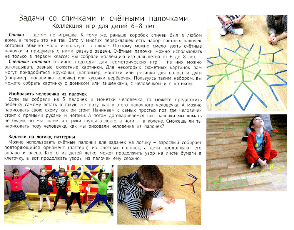 Спички - детям не игрушка. К тому же, раньше коробок спичек был в любом доме, а теперь это не так. Зато у многих первоклашек есть набор счётных палочек, который обычно мало используют в школе. Поэтому можно смело взять счётные палочки и придумать с ними разные задачи. Счётные палочки можно использовать не только в первом классе: мы собрали коллекцию игр для детей от 6 до 8 лет.
