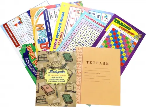 Комплект школьника № 2: 7 в 1 (начальная школа) Состав комплекта: - тетрадь в линию (12 листов); - тетрадь для записи словарных слов и словосочетаний(16 листов); - плакаты "Таблица умножения", "Падежи", "Буквы и звуки русского языка", "Таблица умножения и деления" (формат А4); - таблица-плакат "Саморепетитор. Русский язык и математика" (формат А2).