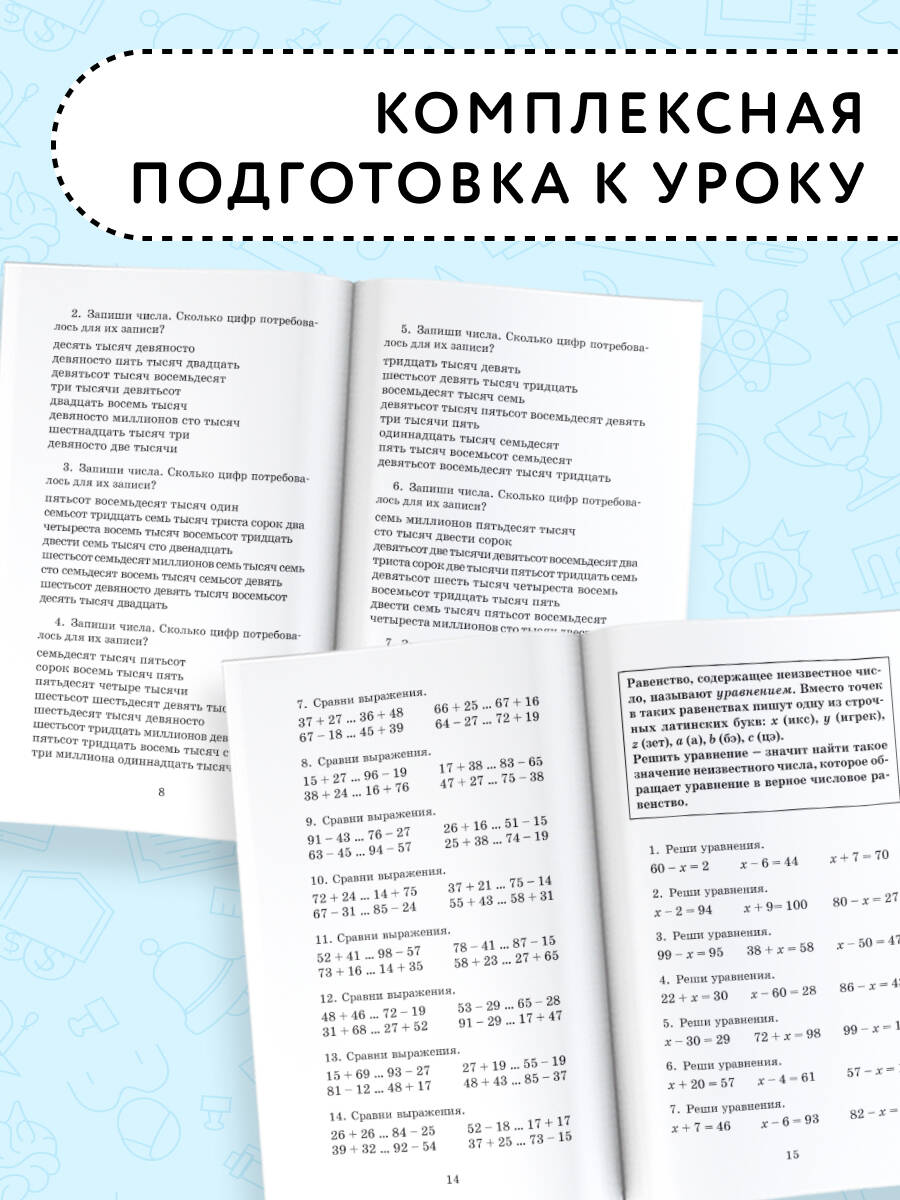 Аннотация: Полный курс математики: 3-й кл. Все типы заданий, все виды задач, примеров, уравнений, неравенств, все контрольные работы, все виды тестов