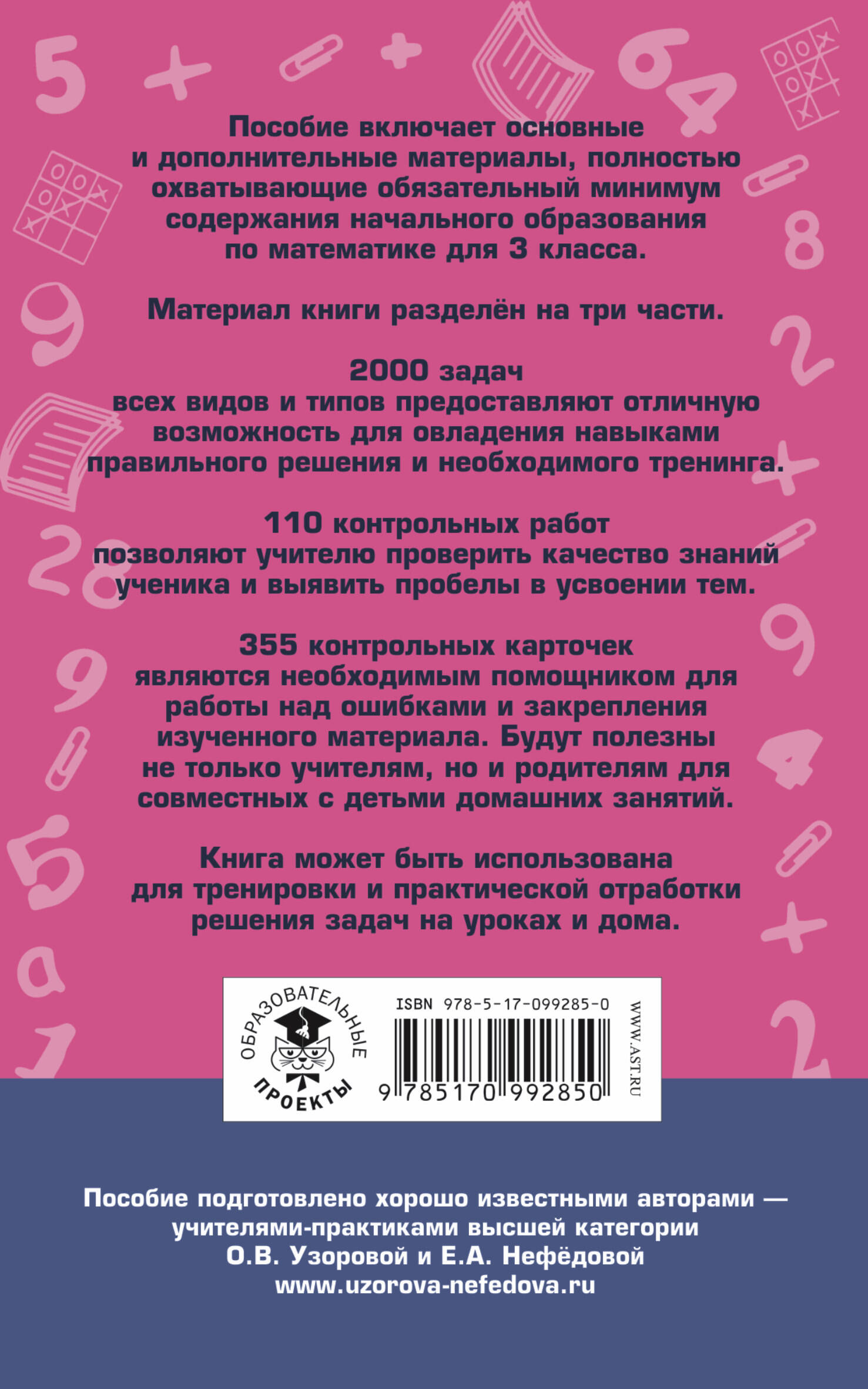 Пособие известных педагогов-практиков, авторов самых издаваемых учебников и учебных пособий в России О.В. Узоровой и Е.А. Нефёдовой включает все типы задач по математике для 3 класса. В одной книге содержатся задачи всех видов и типов; контрольные работы; контрольные карточки для работы над ошибками и закрепления изученного материала. В конце книги для самопроверки даны ответы на все задачи. Пособием удобно пользоваться: в контрольных работах после каждой задачи в скобках указан номер карточки, задачи которой нужно решить дополнительно в случае ошибки. Пособие можно использовать для тренировки и практической отработки решения задач на уроках и дома.| Издательство | ИЗДАТЕЛЬСТВО "АСТ" |