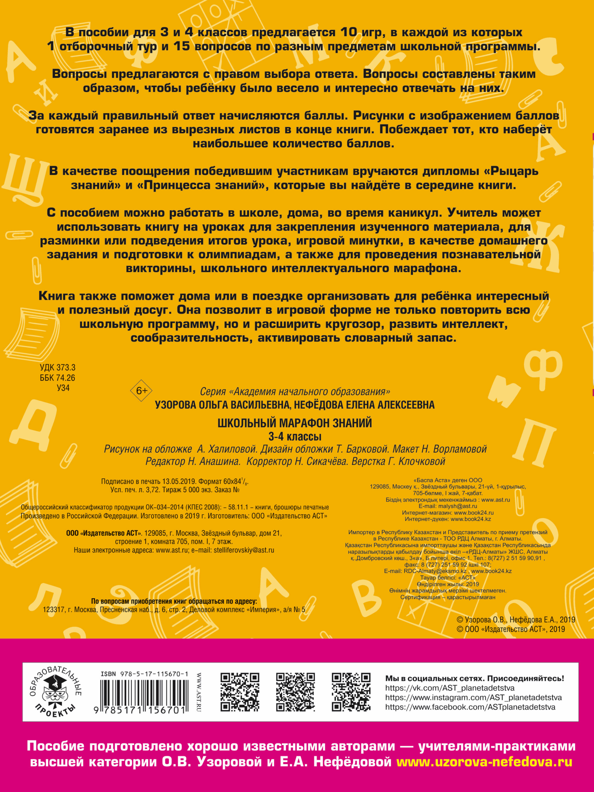 В пособии для 3 и 4 классов предлагается 10 игр, в каждой из которых 1 отборочный тур и 15 вопросов по разным предметам школьной программы. Вопросы предлагаются с правом выбора ответа. Вопросы составлены таким образом, чтобы ребёнку было весело и интересно отвечать на них. За каждый правильный ответ начисляются баллы. Рисунки с изображением баллов готовятся заранее из вырезных листов в конце книги. Побеждает тот, кто наберёт наибольшее количество баллов. В качестве поощрения победившим участникам вручаются дипломы «Рыцарь знаний» и «Принцесса знаний», которые вы найдёте в середине книги. С пособием можно работать в школе, дома, во время каникул. Учитель может использовать книгу на уроках для закрепления изученного материала, для разминки или подведения итогов урока, игровой минутки, в качестве домашнего задания и подготовки к олимпиадам, а также для проведения познавательной викторины, школьного интеллектуального марафона. Книга также поможет дома или в поездке организовать для ребёнка интересный и полезный досуг. Она позволит в игровой форме не только повторить всю школьную программу, но и расширить кругозор, развить интеллект, сообразительность, активировать словарный запас.| Издательство | ИЗДАТЕЛЬСТВО "АСТ" |
