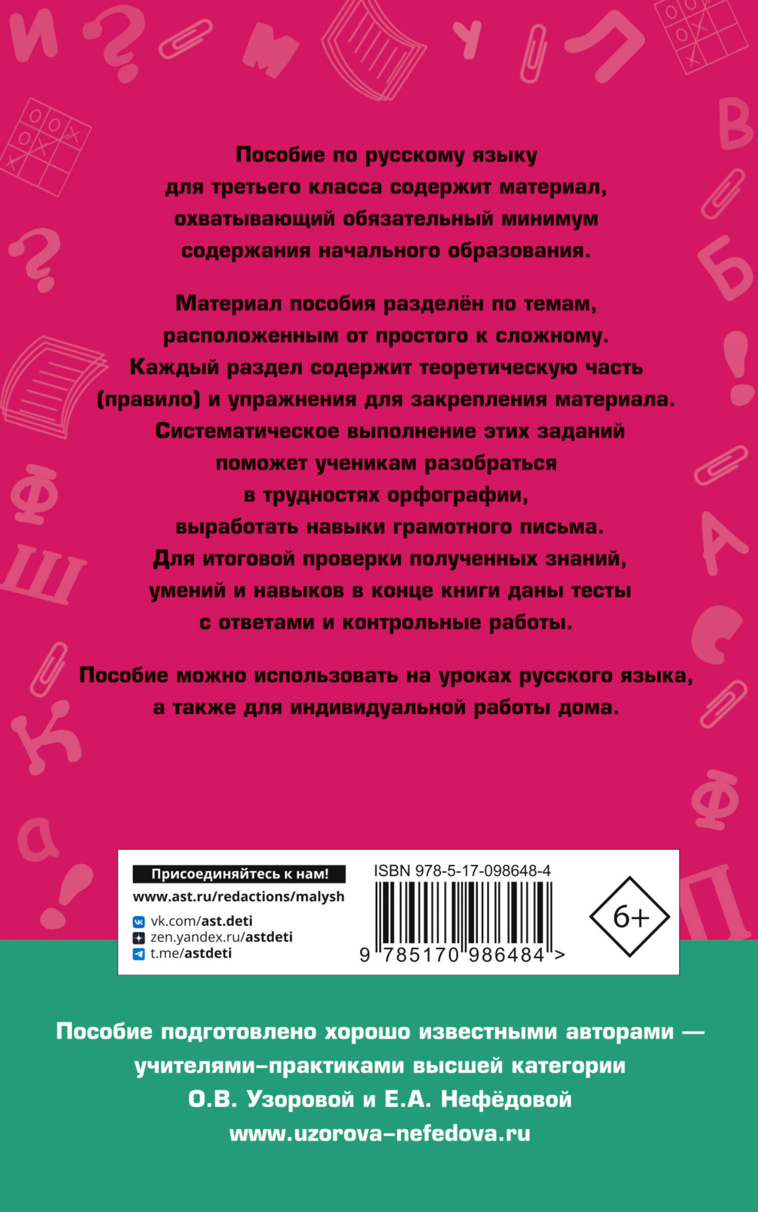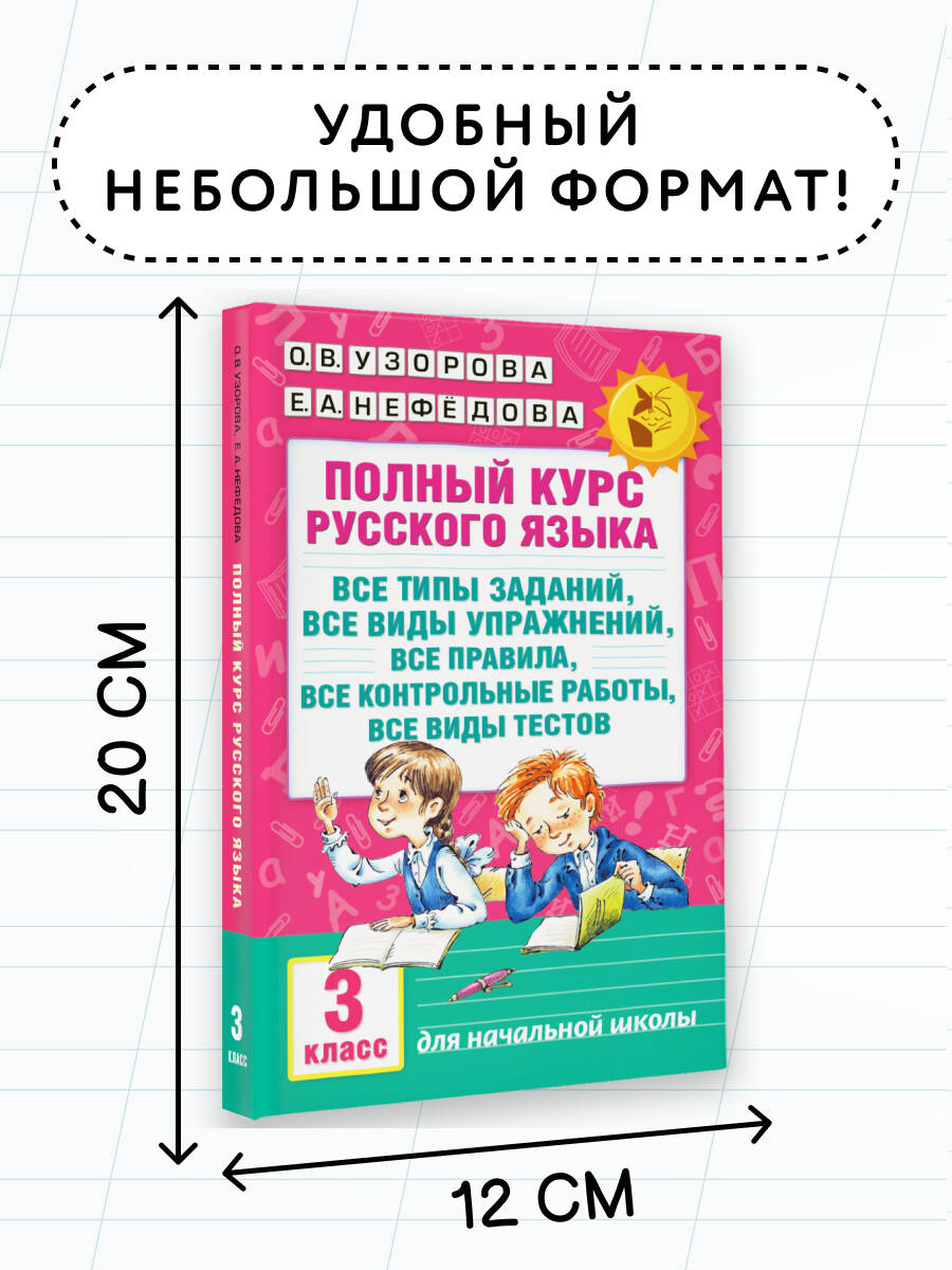 Полный курс русского языка для третьего класса содержит все необходимые правила, которые третьеклассник обязательно должен знать, чтобы потом использовать выученную теорию на практике. С помощью разнообразных упражнений, а также контрольных и тестовых заданий ученики лучше осваивают изучаемую тему, тренируют память, повышают орфографическую зоркость и культуру письменной речи. Книгу можно использовать на уроках русского языка, а также для индивидуальной работы дома.| Издательство | ИЗДАТЕЛЬСТВО "АСТ" |