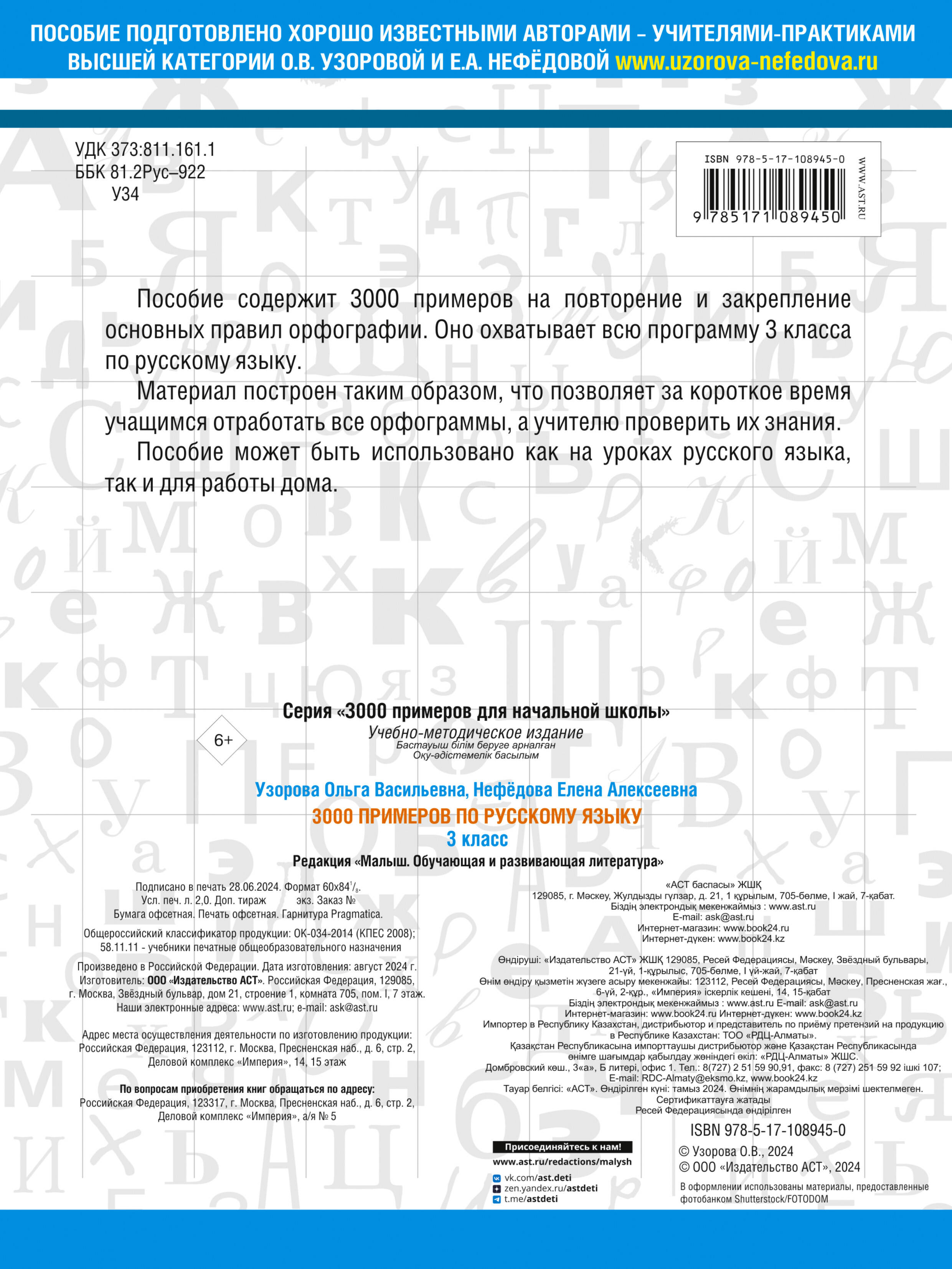 Пособие известных педагогов-практиков, авторов самых издаваемых учебников и учебных пособий в России О.В. Узоровой и Е.А. Нефёдовой содержит примеры на повторение и закрепление основных правил орфографии, предусмотренных программой по русскому языку для 3 класса. За короткое время учащиеся смогут отработать все орфограммы. Пособие может быть использованно как на уроках русского языка, так и для работы дома.| Издательство | ИЗДАТЕЛЬСТВО "АСТ" |
