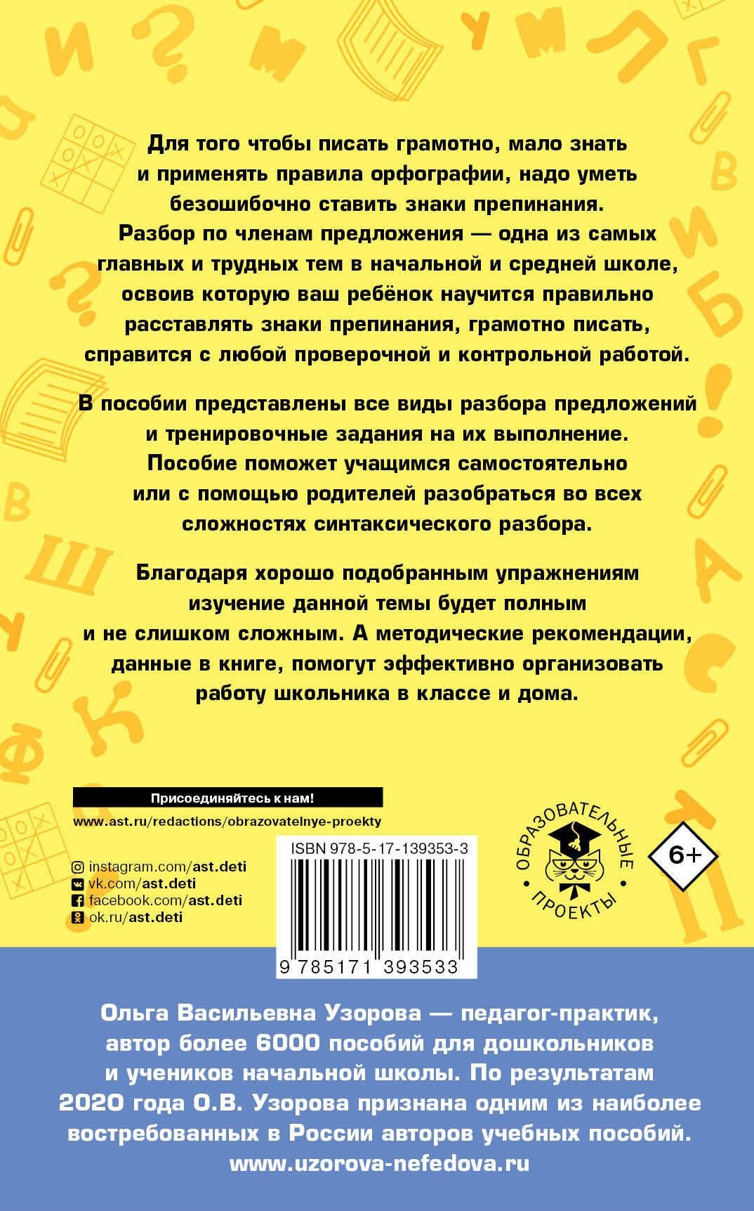 Для того чтобы писать грамотно, мало знать и применять правила по орфографии, надо уметь безошибочно ставить знаки препинания. Разбор по членам предложения - одна из самых главных и трудных тем в начальной и средней школе, освоив которую ваш ребёнок научится правильно расставлять знаки препинания, грамотно писать, справится с любой проверочной и контрольной работой. В пособии представлены все виды разбора предложений и тренировочные задания на их выполнение. Пособие поможет учащимся самостоятельно или с помощью родителей разобраться во всех сложностях синтаксического разбора. Благодаря хорошо подобранным упражнениям изучение данной темы будет полным и не слишком сложным. А методические рекомендации, данные в книге, помогут эффективно организовать работу школьника в классе и дома.| Издательство | ИЗДАТЕЛЬСТВО "АСТ" |