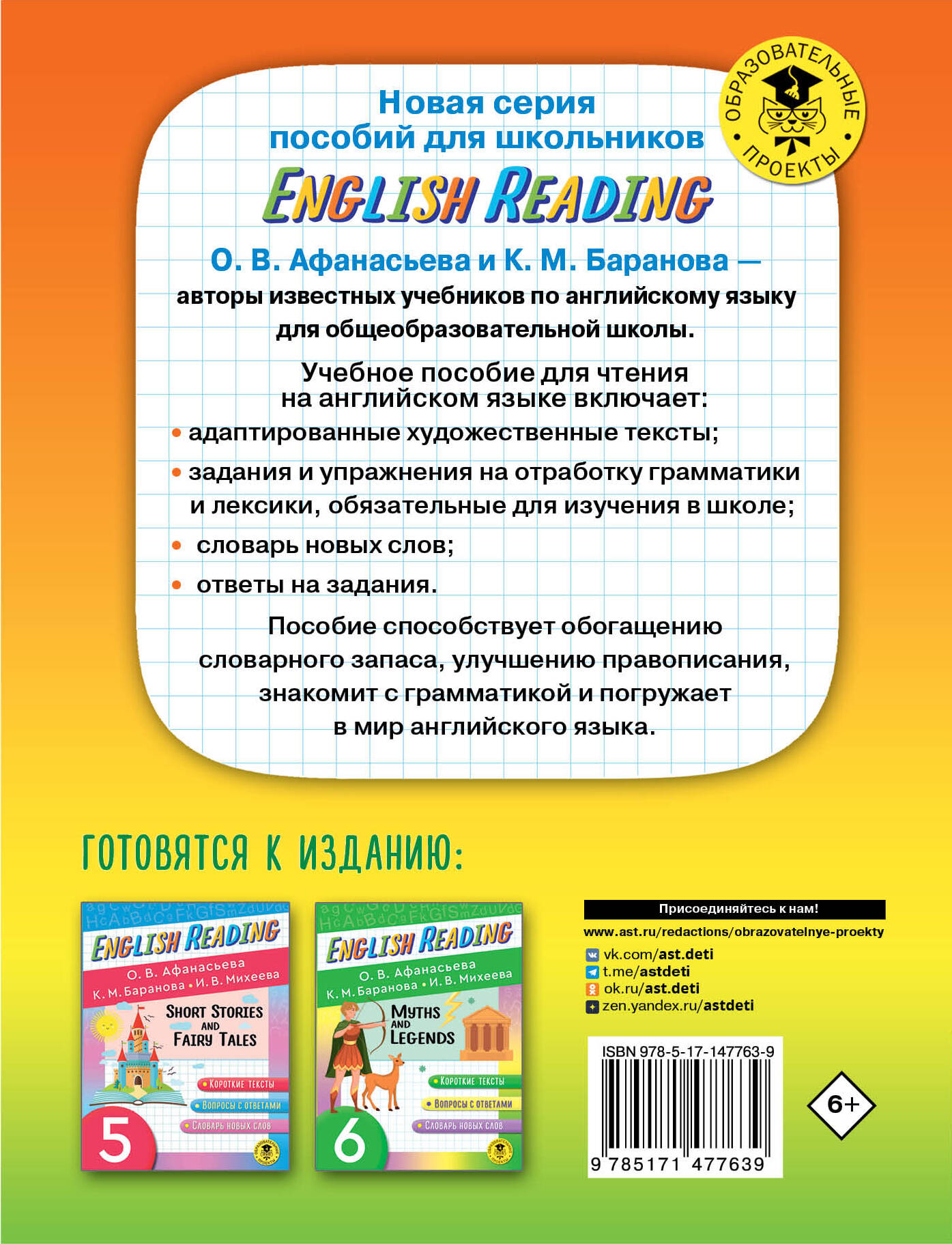Мы знаем, что вы любите читать! Ведь известно, что чтение можно сравнить с увлекательным путешествием, во время которого мы узнаем много нового, интересного и полезного. Читать на иностранном языке не менее интересно, чем на родном. Различные истории, легенды и рассказы помогут вам познакомится с английским языком, со английскими словами и структурами. Учебные пособия для чтения на английском языке включают: - адаптированные художественные произведения; - задания и упражнения на отработку грамматики и лексики, обязательных для изучения в школе, их выполнение даёт возможность глубоко вникнуть в смысл прочитанного, усвоить новую лексику и подготовиться к изложению содержания на английском языке. Все задания творческого характера предназначены для развития коммуникативных умений в чтении и говорении; -словарь новых слов; -ответы на все задания. Авторы пособий - О.В.Афанасьева, К.М. Баранова и И.В.Михеева - авторы основных учебников по английскому языку для общеобразовательной школы, включенных в ФП.| Издательство | АСТ |