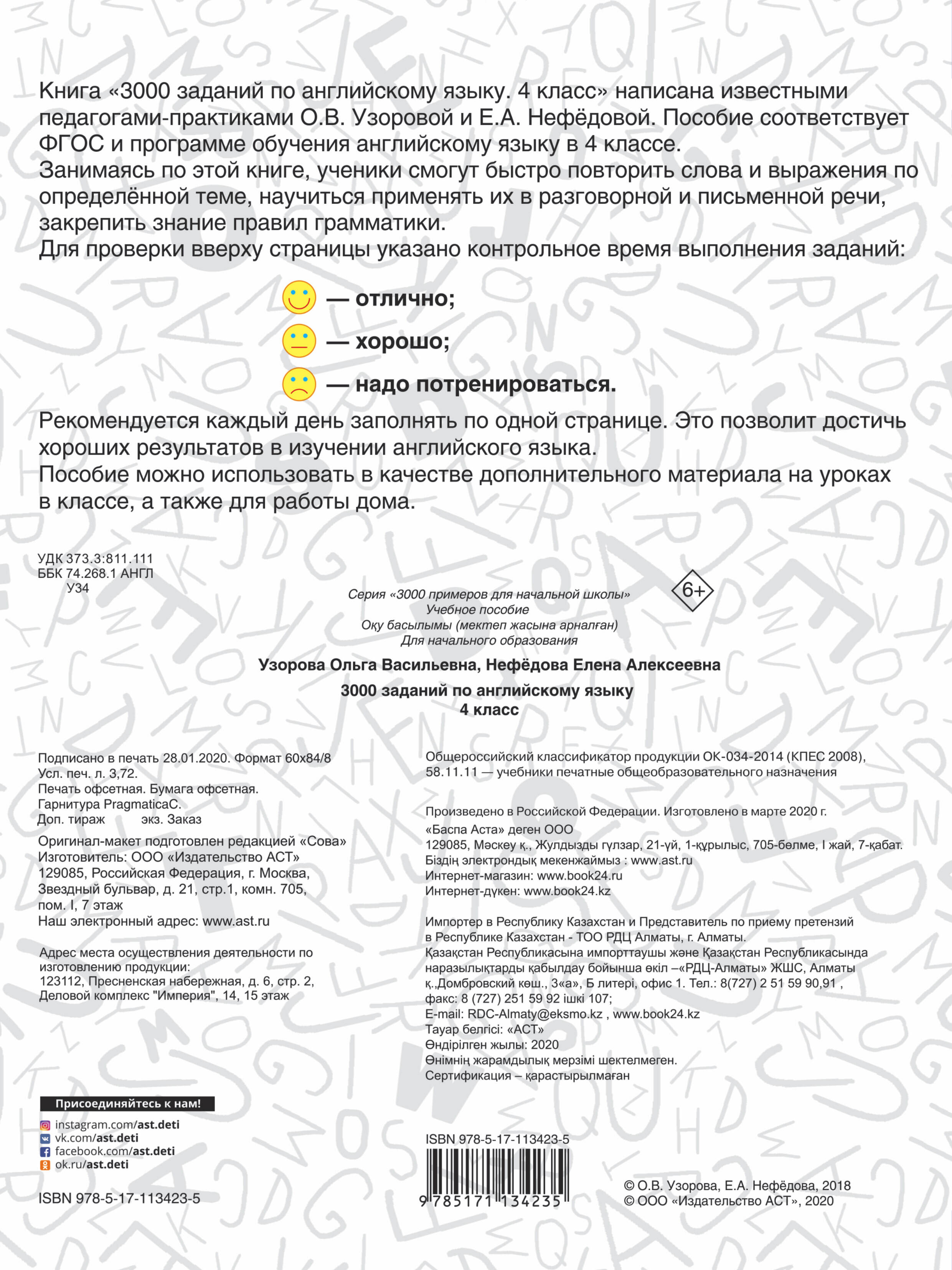 О чем эта книга Учебное пособие известных педагогов-практиков О. В. Узоровой и Е. А. Нефёдовой позволит ученикам 4 класса проверить свои знания по английскому языку, а учителю и родителям - проконтролировать их. Кому эта книга будет интересна Отличное пособие для школьников младших классов. Каковы особенности этой книги - Соответствует ФГОС и программе обучения английскому языку в 4 классе. - Каждый раздел, соответствующий определённой теме, содержит задания на отработку лексики и на закрепление знания правил грамматики. - Даёт возможность ученикам быстро проверить свои знания по английскому языку за 4 класс, а учителю и родителям - проконтролировать их, то есть отметить время, которое ребёнок затратил на выполнение заданий. - Для проверки на каждой странице дано контрольное время выполнения заданий.| Издательство | ИЗДАТЕЛЬСТВО "АСТ" |