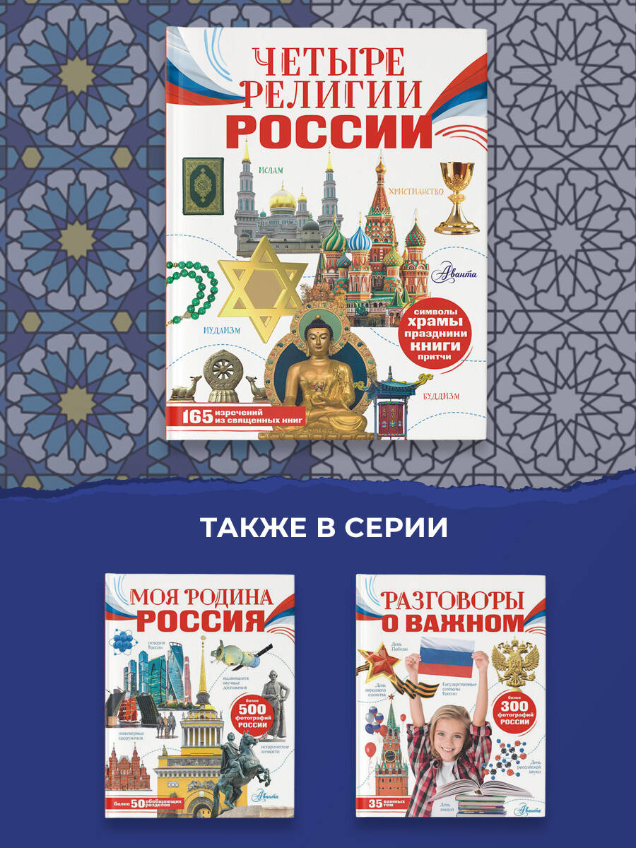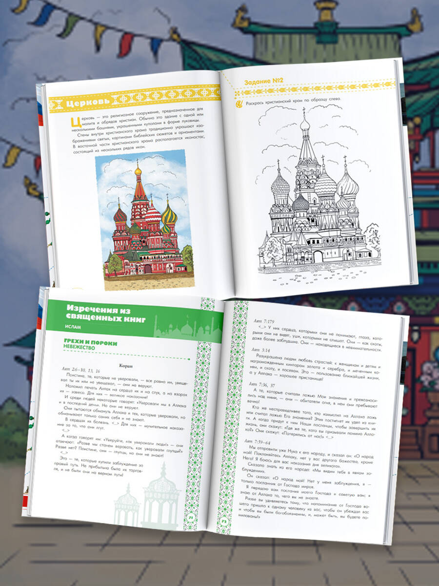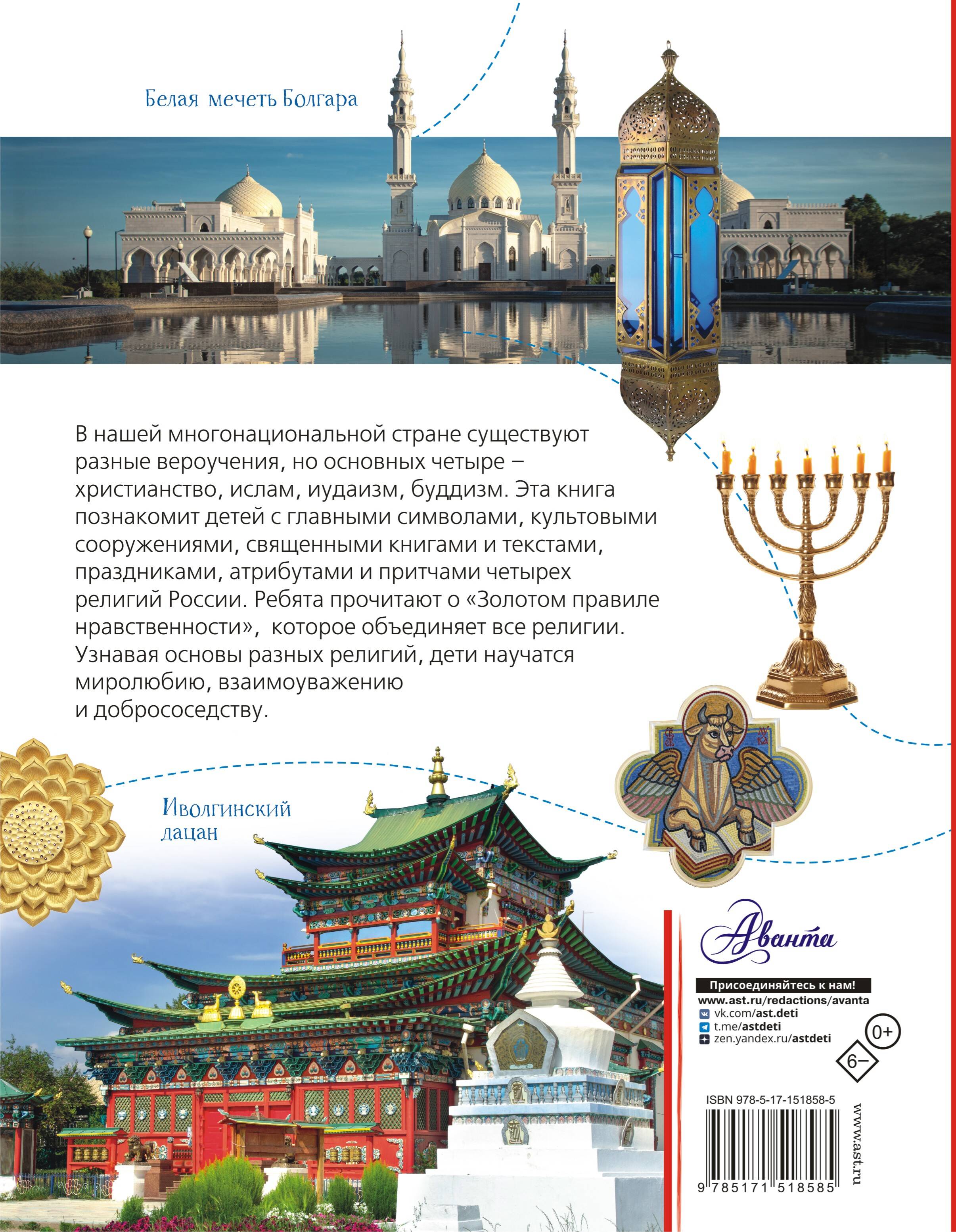 В нашей многонациональной стране существуют разные вероучения, но самых больших религиозных направлений четыре - христианство, ислам, иудаизм, буддизм. Эта книга познакомит детей с их главными символами, культовыми сооружениями, священными книгами и текстами, праздниками, атрибутами и притчами. Ребята узнают, как каждая из религий относится к порокам и добродетелям, отношению к людям, прочитают о «Золотом правиле нравственности», которое объединяет все религии. Узнавая основы разных религий, дети научатся миролюбию, взаимоуважению и добрососедству. Книга поможет детям легче освоить школьный предмет "Основы религиозных культур и светской этики".| Издательство | ИЗДАТЕЛЬСТВО "АСТ" |