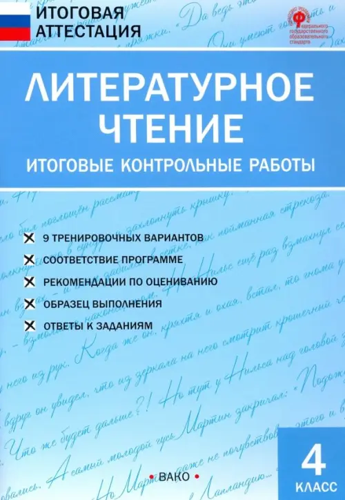 В издании представлены 9 вариантов итоговой контрольной работы по курсу «Литературное чтение» за 4 класс, составленных с учётом требований ФГОС начального общего образования и требований к уровню подготовки учащихся. Каждый вариант содержит 18 заданий. Приведён образец выполнения итоговой контрольной работы. В конце издания даны ответы.