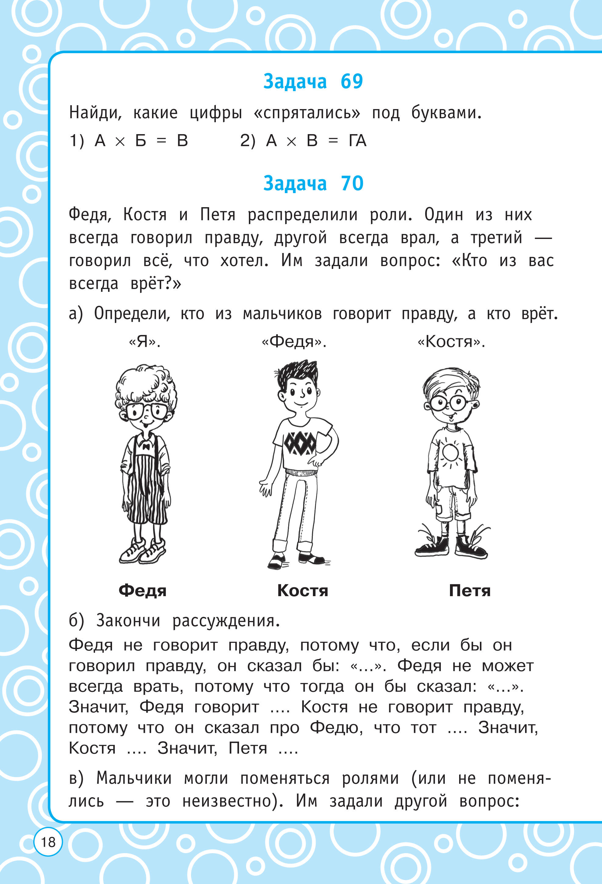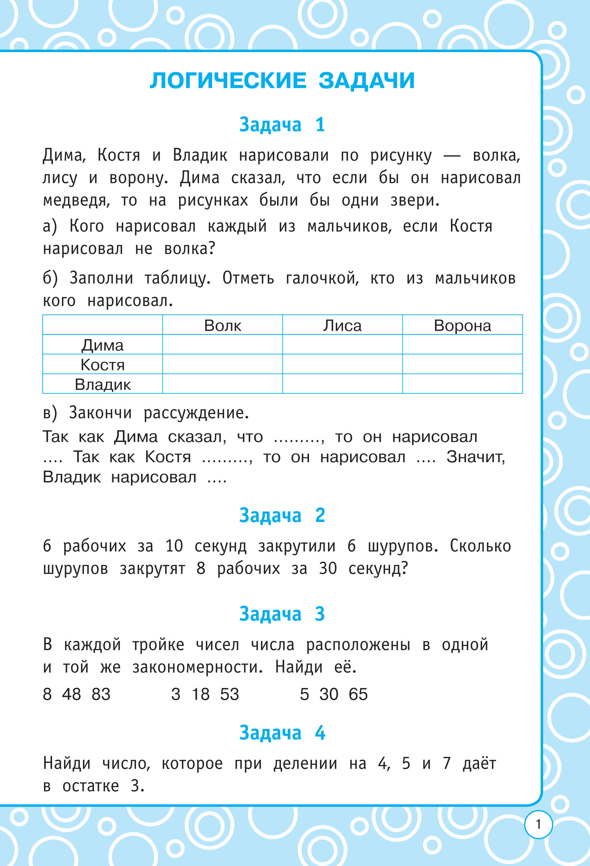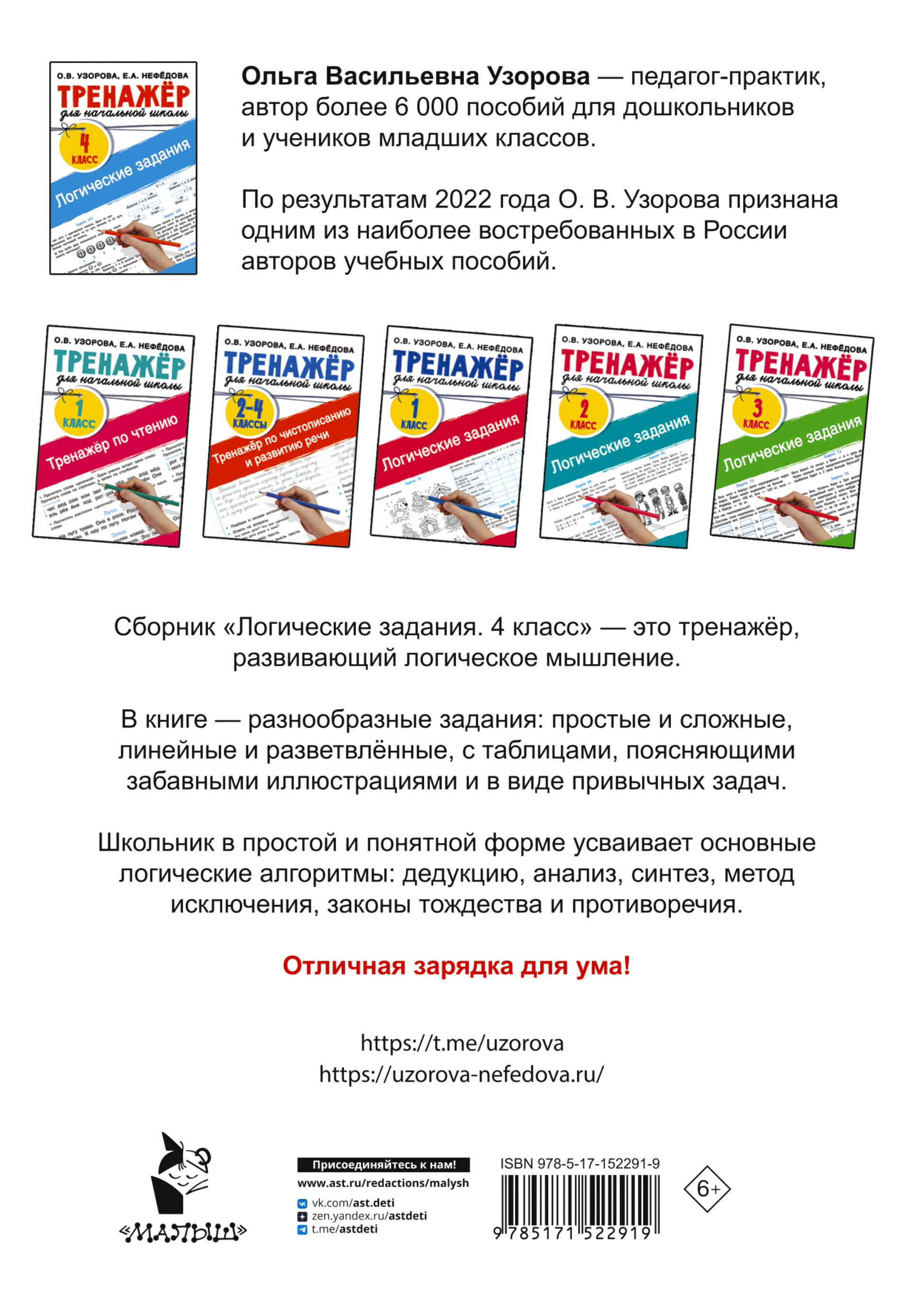 Ольга Васильевна Узорова - известный педагог-практик, автор более 6 000 книг для дошкольников и учеников младших классов. По результатам 2022 года О. В. Узорова признана одним из наиболее востребованных в России авторов учебных пособий. Сборник «Логические задания. 4 класс» - это тренажёр, развивающий логическое мышление. Книга содержит разнообразные задания: простые и сложные, линейные и разветвлённые, с таблицами, поясняющими забавными иллюстрациями и в виде привычных задач. Незаметно для себя четвероклассник в простой и понятной форме постигает основные логические алгоритмы: дедукцию, анализ, синтез, метод исключения, законы тождества и противоречия. Пусть ребёнок учится легко!| Издательство | ИЗДАТЕЛЬСТВО "АСТ" |