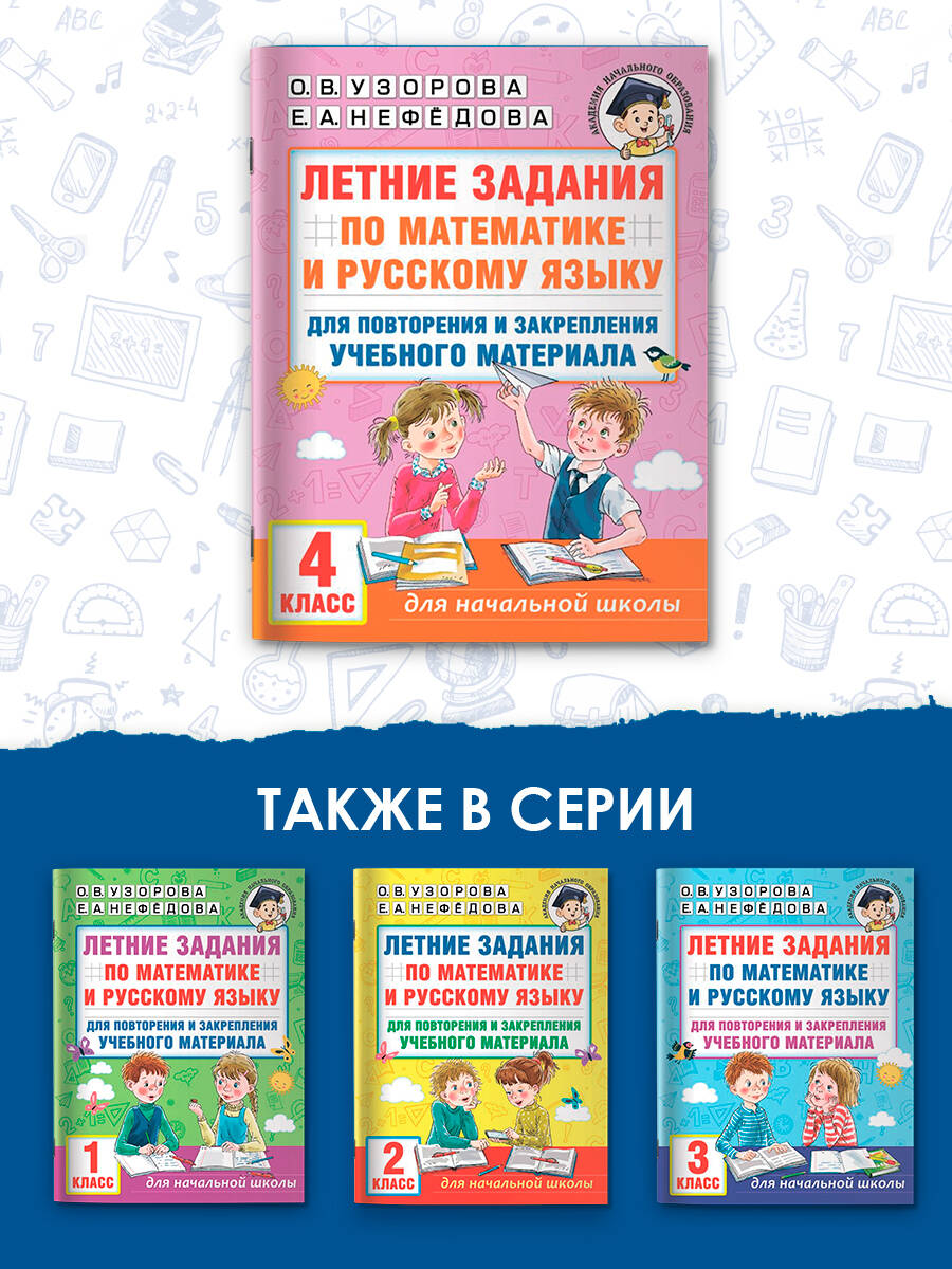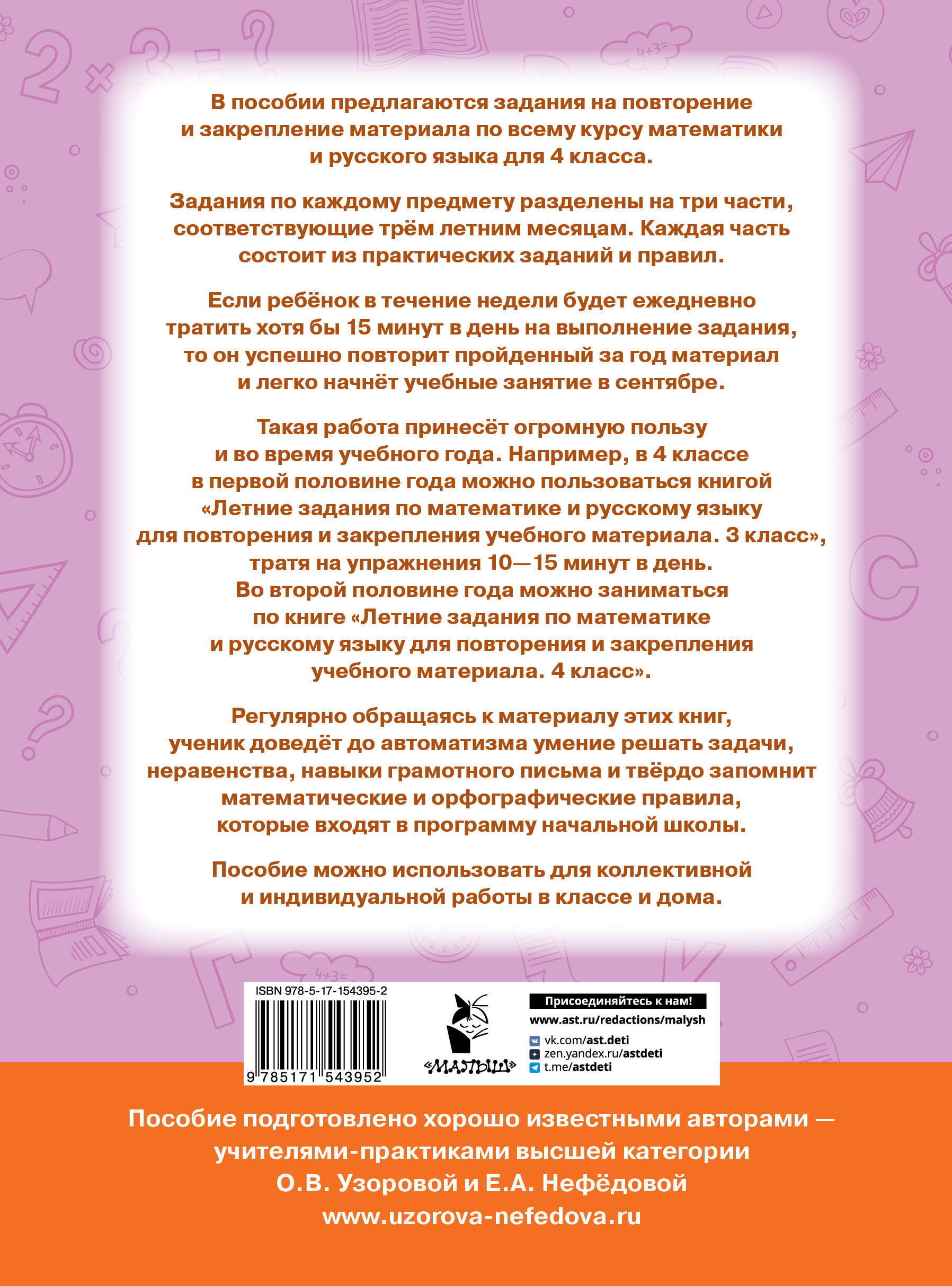 В пособии предлагаются задания на повторение и закрепление материала по всему курсу математики и русского языка для 4 класса. Занимаясь всего 15 минут в день, ребёнок успешно повторит пройденный за год материал и легко начнёт учебные занятие в сентябре. Регулярно обращаясь к этой книге, ученик доведёт до автоматизма умение решать задачи, неравенства, навыки грамотного письма и твёрдо запомнит математические и орфографические правила, которые входят в программу начальной школы. Пособие можно использовать для коллективной и индивидуальной работы в классе и дома. О. В. Узорова и Е.А Нефёдова - известные педагоги-практики, авторы самых издаваемых учебников и учебных пособий в России. Основанные на авторской методике, доказавшей свою эффективность миллионными тиражами, эти пособия помогут родителям подготовить ребенка к школе, а ученикам - легко и эффективно освоить программу начальной школы. Все, что поможет ребенку стать успешным в учёбе, вы найдёте в книгах Узоровой и Нефёдовой: тексты для 4 класса, контрольное списывание, диктанты по русскому языку, подготовка к диктантам, задания по русскому языку, тесты по русскому языку, примеры по математике, сложение, вычитание, задания по математике, задачи по математике, контрольная работа, самостоятельная работа, проверочные работы, тесты по математике, математические диктанты, устный счёт, справочное пособие, рабочая тетрадь, комплект рабочих тетрадей, решаем примеры, решаем задачи, тренинг, разные виды сложности, сборники заданий, комплексные работы, летние задания, 4 класс, возраст 9-10 лет.| Издательство | Издательство "АСТ" |