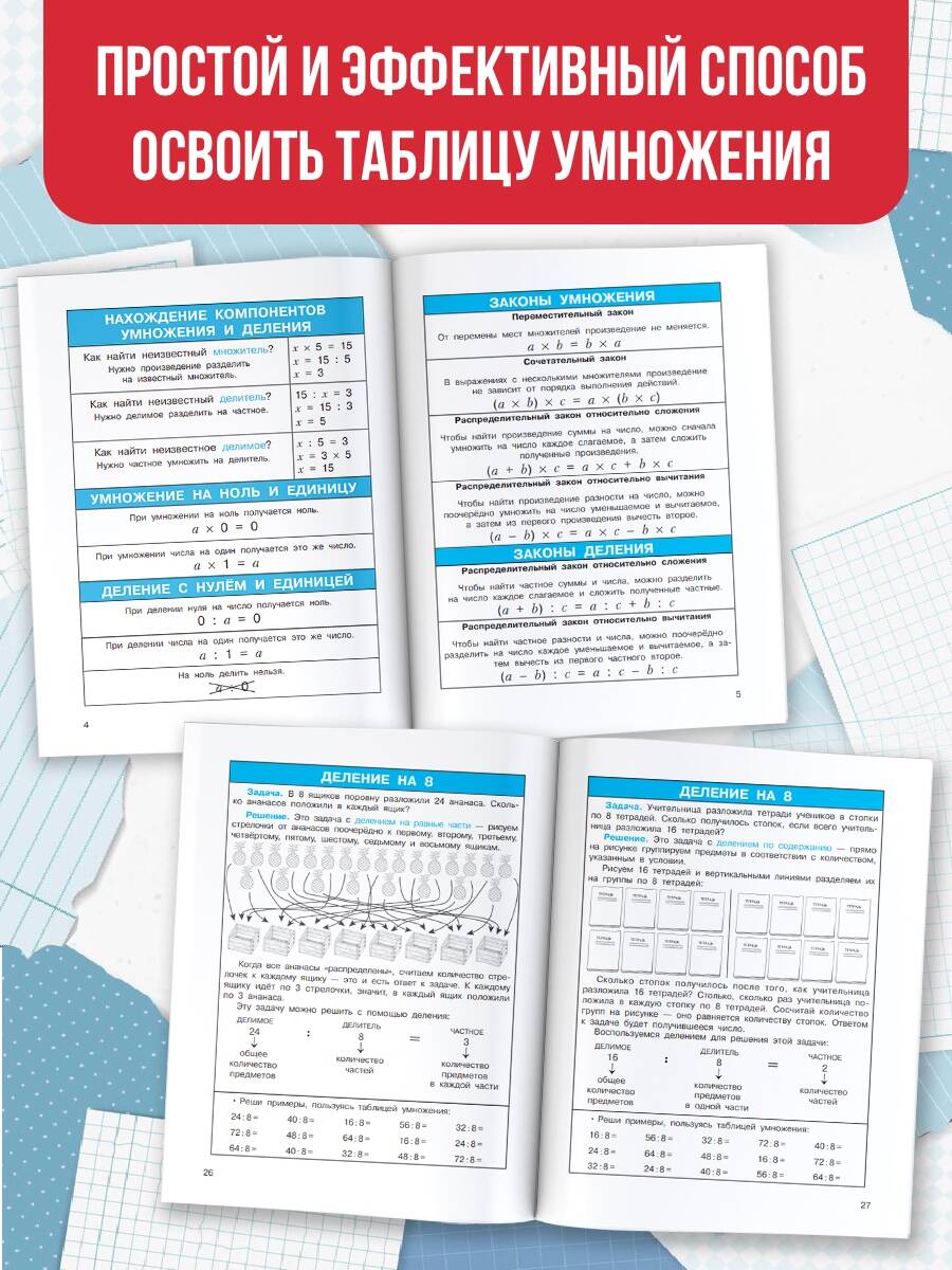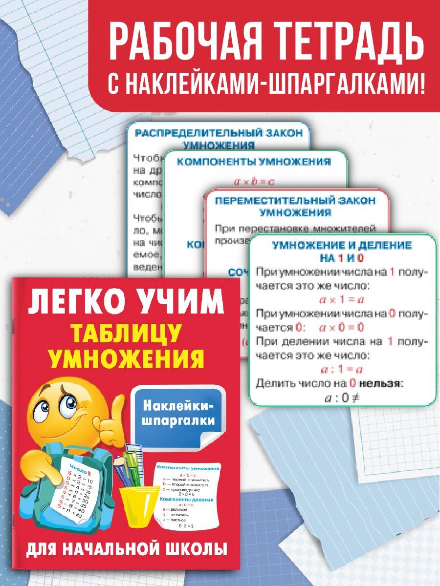«Легко учим таблицу умножения» - это пособие для учеников 1−4 классов. Занятия по книге - простой и эффективный способ освоить таблицу умножения. Школьники выучат законы умножения и деления, научатся решать разные типы задач и закрепят полученные знания с помощью примеров. Отдельные элементы текста в пособии выделены цветом - это упрощает запоминание информации. Также в книге даны цветные наклейки-шпаргалки. Стикеры с примерами из таблицы умножения можно наклеить на обложку учебника или тетради - таким образом, подсказка всегда будет перед глазами.