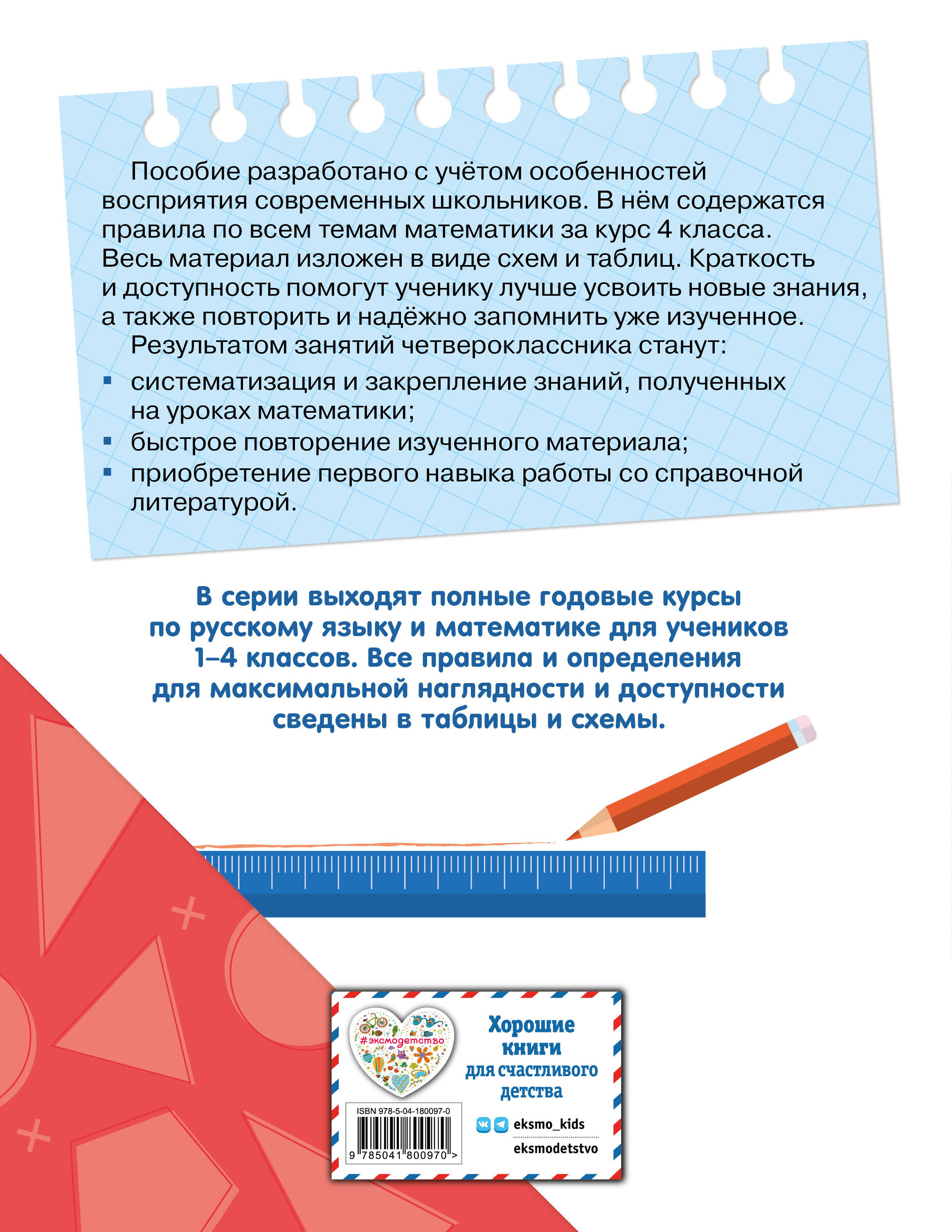 Справочники для учеников начальной школы должны быть краткими и понятными. В данном пособии предельно доступно, в виде таблиц и схем, изложен весь курс математики за 4 класс. Такая подача материала делает процесс поиска и запоминания информации максимально быстрым и лёгким. Современное и удобное в использовании пособие полностью соответствует всем требованиям ФГОС начального общего образования.| Издательство | ООО "Издательство "Эксмо" |