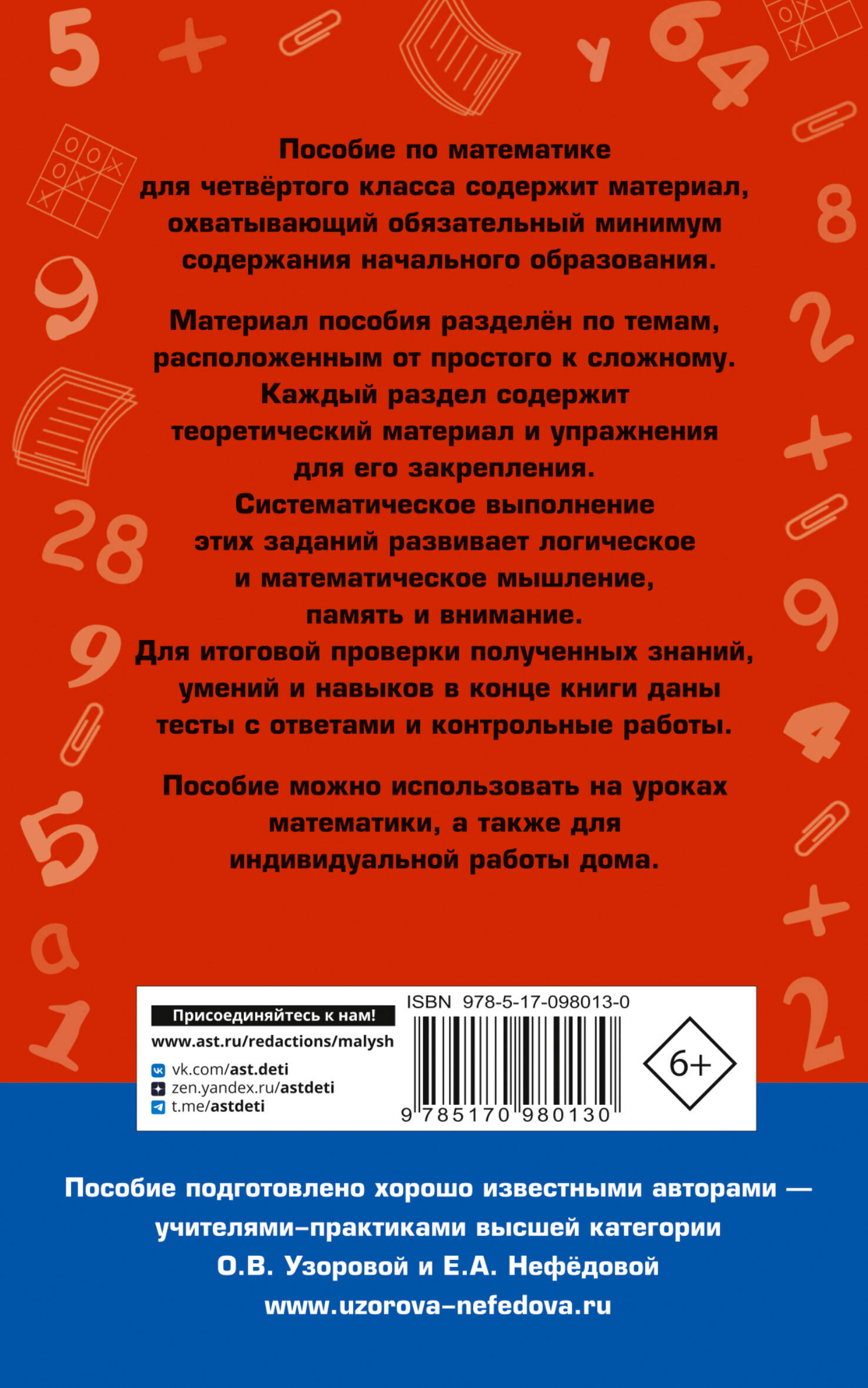 Полный курс математики для четвёртого класса содержит все необходимые правила, все типы заданий, которые четвероклассник обязательно должен знать, чтобы потом использовать выученную теорию на практике. С помощью разнообразных упражнений, а также контрольных и тестовых заданий ученики лучше осваивают изучаемую тему, тренируют память, развивают логическое мышление. Пособие можно использовать на уроках математики, а также для индивидуальной работы дома.| Издательство | ИЗДАТЕЛЬСТВО "АСТ" |