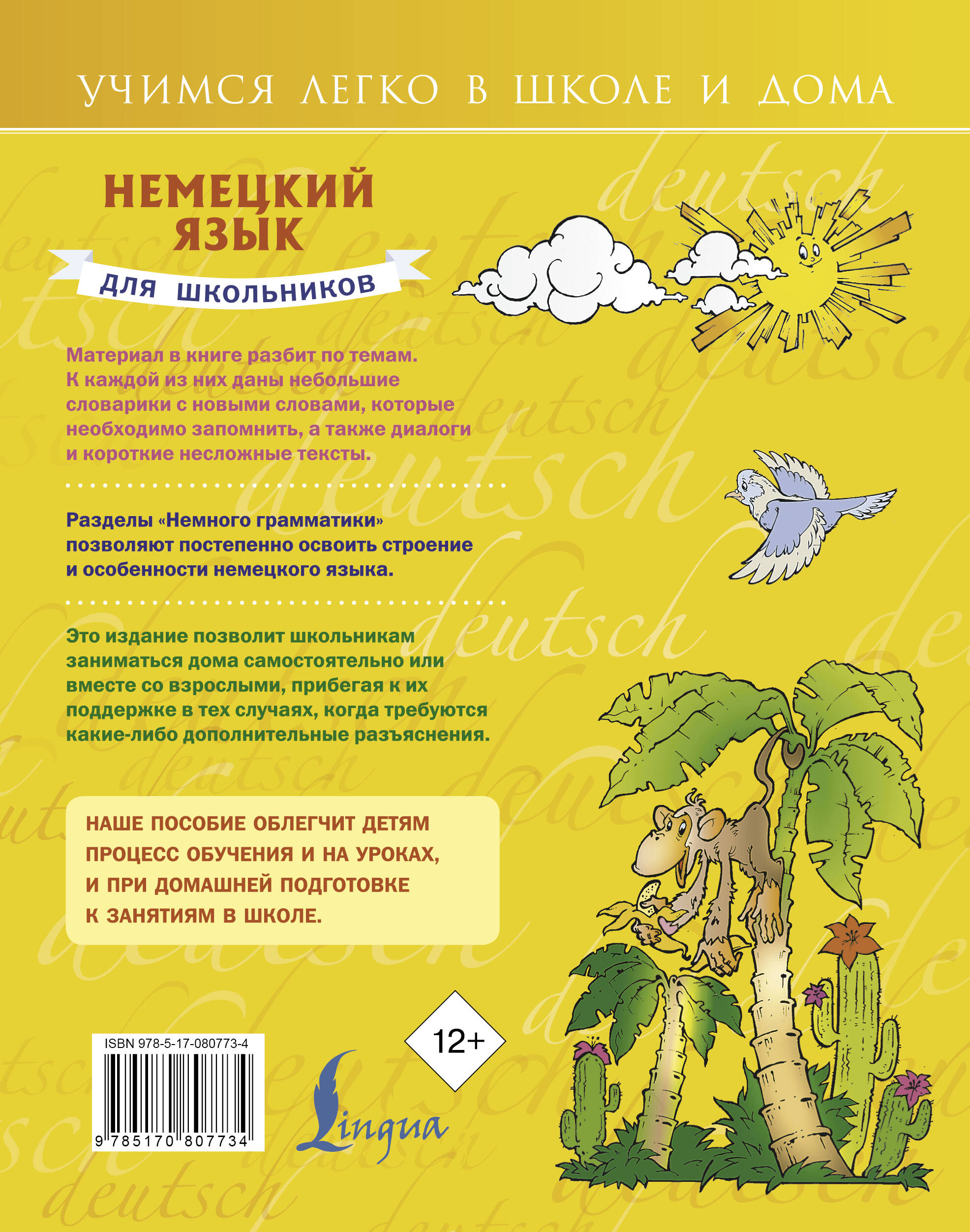 Настоящая книга представляет собой учебное пособие для школьников, начинающих изучать немецкий язык. Материал разбит по темам. К каждой даны словарики с новыми словами для заучивания, а также короткие несложные рассказы и диалоги. Строение немецкого языка раскрывается в разделах "Немного грамматики". С помощью этого пособия школьники могут заниматься дома самостоятельно, прибегая к помощи взрослых только в тех случаях, когда требуются дополнительные разъяснения.| Издательство | Издательство "АСТ" |