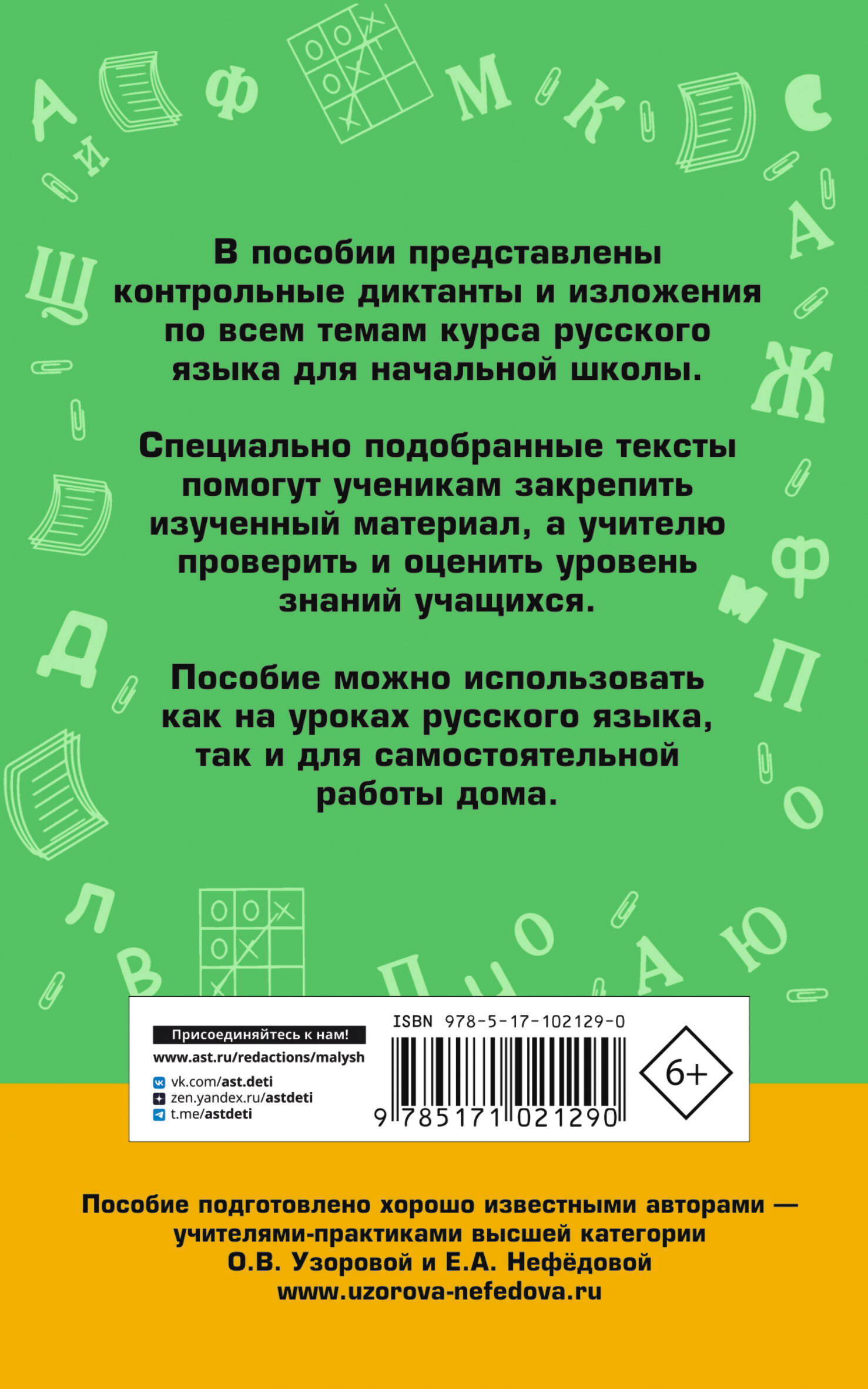 В пособии представлены контрольные диктанты и изложения по всем темам курса русского языка для начальной школы. Для удобства пользования материал разбит по классам и полугодиям. Пособие можно использовать на уроках русского языка и для самостоятельной работы дома.