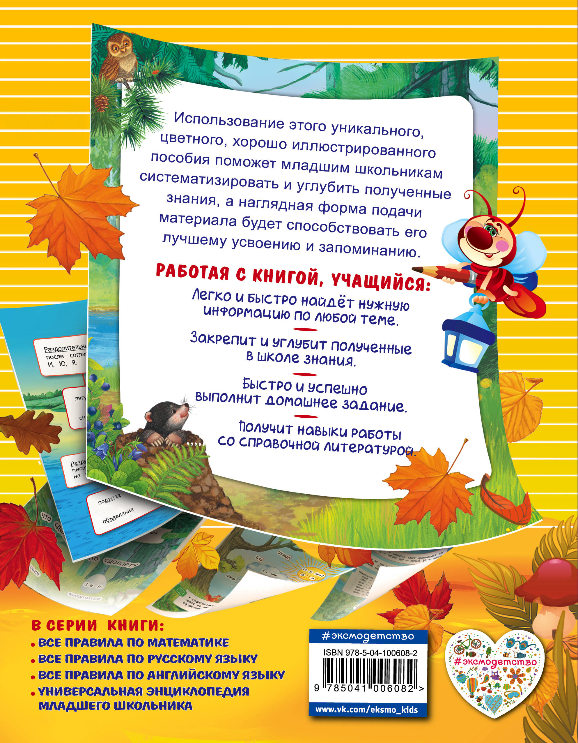 Необычный цветной, иллюстрированный справочник для учащихся 1-4 классов подготовлен в соответствии с требованиями ФГОС для начальной школы. В книге в наглядном виде представлены все темы по русскому языку. Работая с пособием, ребёнок систематизирует, углубит и закрепит знания русского языка, разовьёт речь, внимание и память. Нестандартная игровая форма подачи материала поможет младшим школьникам легко запомнить даже самые сложные правила. Книгу можно использовать как для подготовки к урокам, так и для работы в классе. Приобретая справочник для своего ребёнка, вы поможете ему: 1) получить полную информацию по всем темам; 2) без труда найти нужные сведения; 3) углубить и расширить полученные знания; 4) быстро и успешно выполнить домашнее задание; 5) получить навыки работы со справочной литературой; 6) получить эстетическое удовлетворение от красивой, хорошо иллюстрированной книги.| Издательство | ООО "Издательство "Эксмо" |