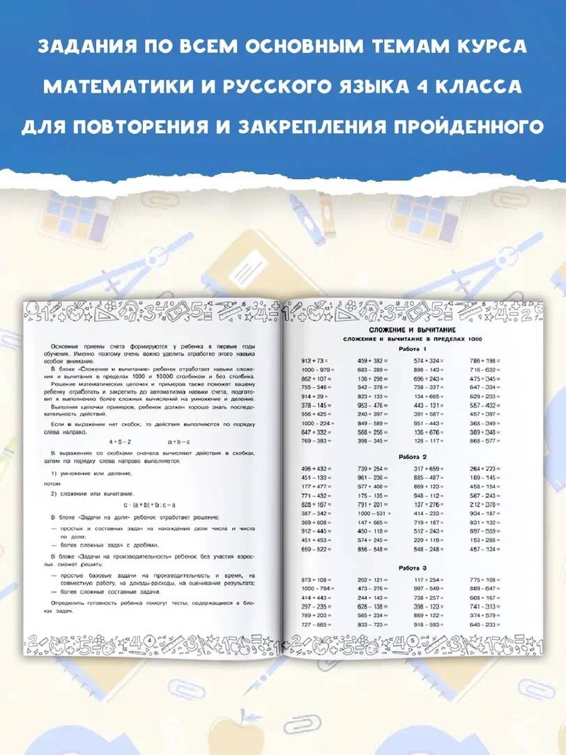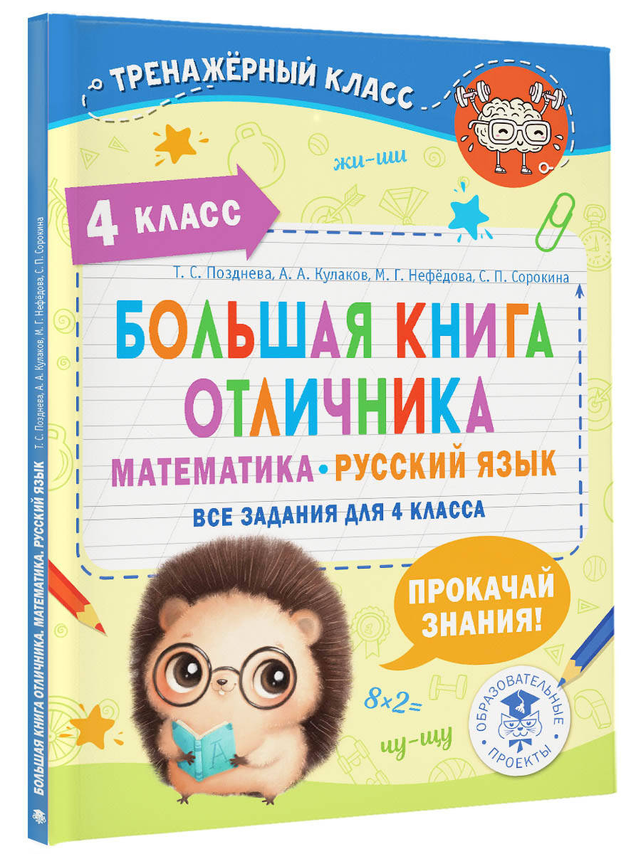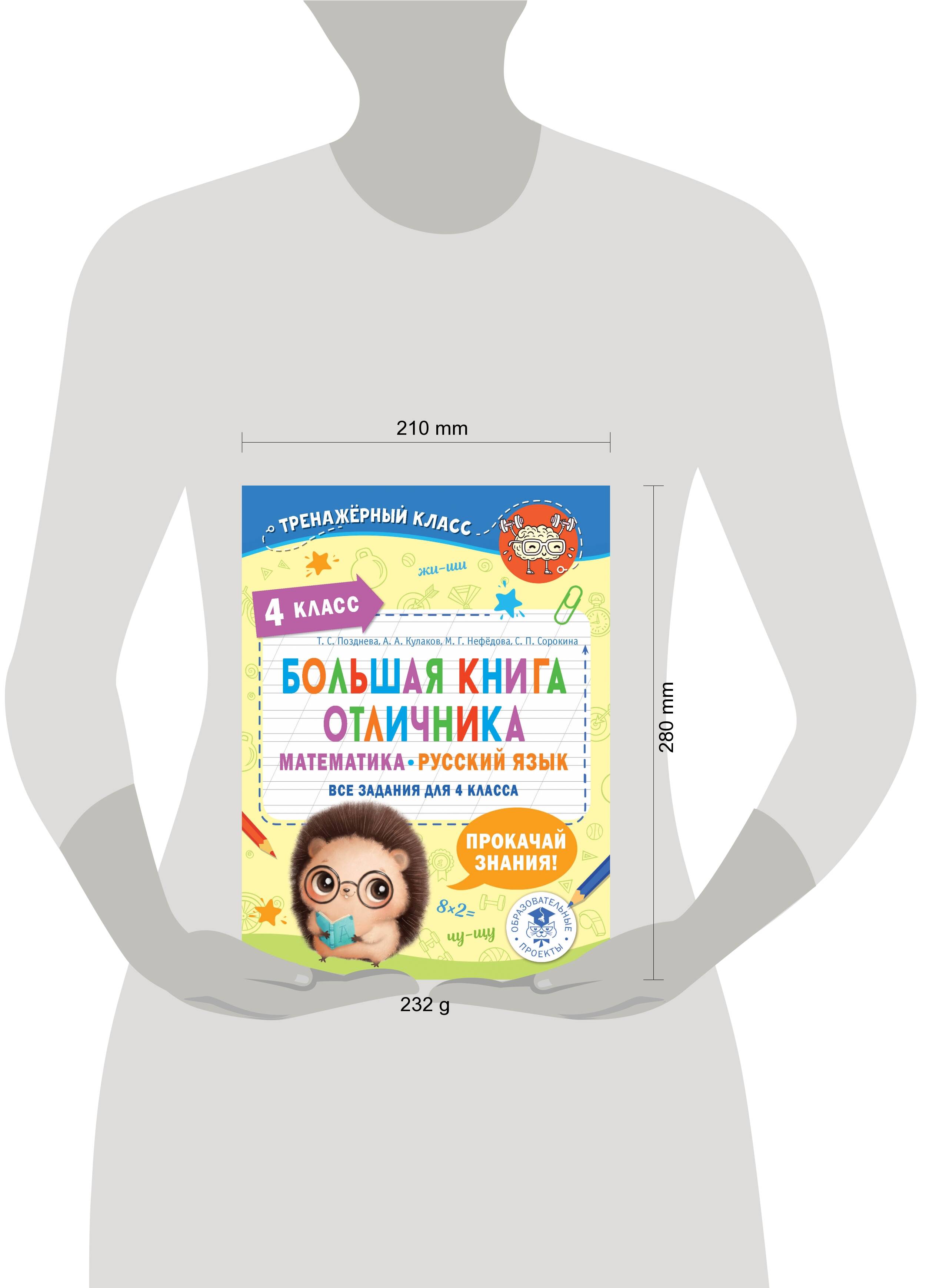 В пособии "Большая книга отличника. Математика. Русский язык" вы найдёте разные виды заданий на закрепление и повторение всех тем школьной программы по математике и русскому языку за 4-й класс. В разделе "Математика" ваш ребенок повторит и закрепит все навыки счёта от 1000 до 10 000; отработает решение простых и базовых задач на доли и на производительность. Определить готовность ребёнка помогут тесты, содержащиеся в блоках задач. В раздел "Русский язык" включены упражнения и задания на правописание приставок, суффиксов и окончаний. Изучение состава слова является одной из важных тем в начальной школе, так как влияет на формирование грамотного письма. В блоке "Правописание приставок, суффиксов, окончаний" даны основные правила правописания, а также задания на отработку и закрепление материала. Повторяя изученное в 4-м классе, ребенок прямо в пособии сможет пройти тестовые задания по русскому языку за весь курс 4-го класса. Пособие может быть использовано дома для закрепления изученного материала, во время каникул для быстрого повторения той или иной темы учебного курса, а также на уроках математики и русского языка в школе для проведения самостоятельных работ и подготовки к ВПР по русскому языку и математике| Издательство | Издательство "АСТ" |