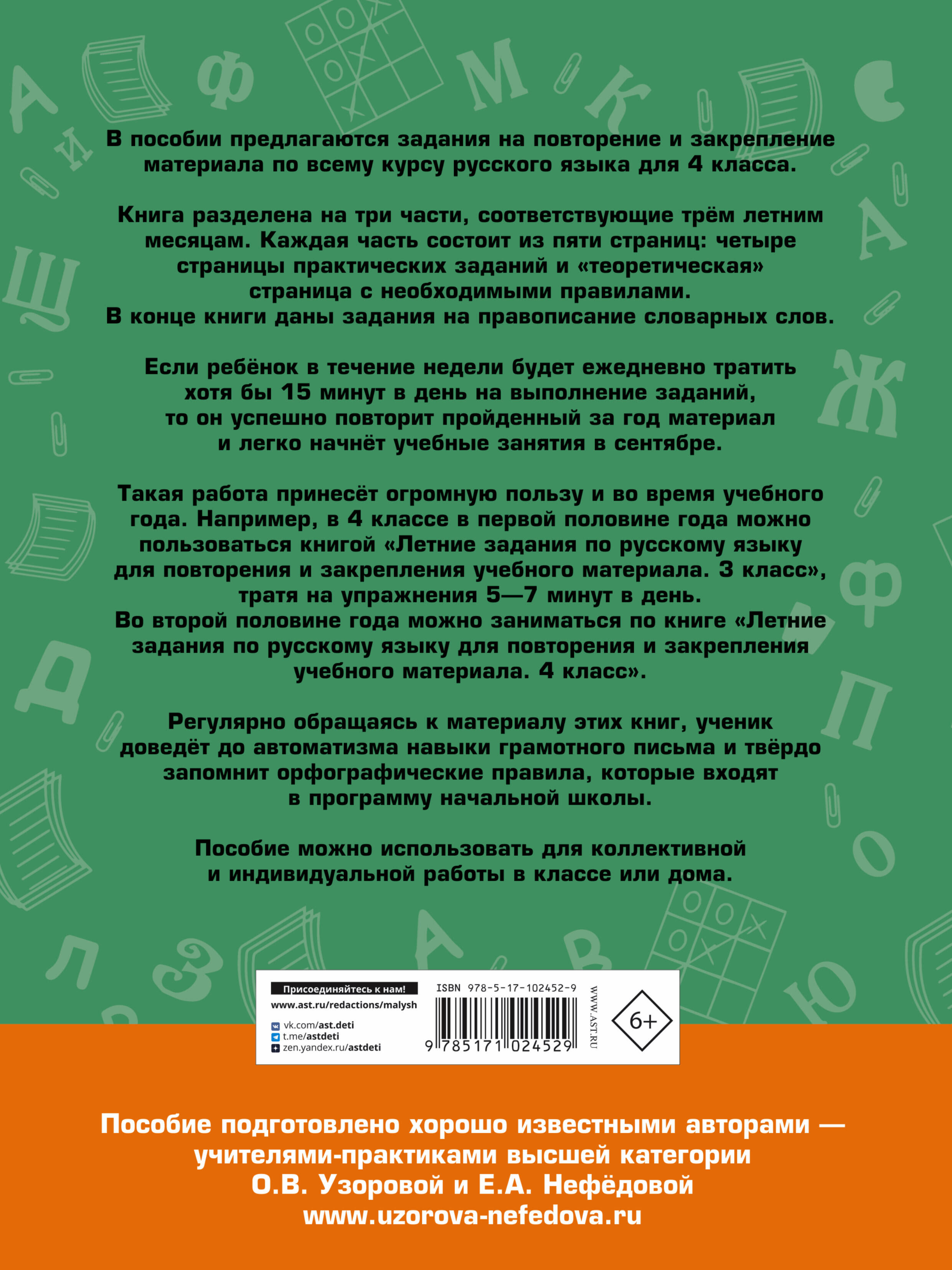 В пособии предлагаются задания на повторение и закрепление материала по всему курсу русского языка для 4 класса. Материалы книги разделены на несколько частей. За каждым блоком практических заданий следует "теоретическая" страница с необходимыми правилами. в конце книги даны словарные слова. Если ребёнок будет тратить по 1 часу в неделю на выполнение этих заданий, то он успешно повторит пройденный материал и повысит свою грамотность. Регулярно обращаясь к материалу этих книг, ученик доведёт до автоматизма навыки граммотного письма и твёрдо запомнит орфографические правила, которые входят в программу начальной школы. Пособие можно использовать для коллективной и индивидуальной работы в классе или дома.| Издательство | ИЗДАТЕЛЬСТВО "АСТ" |