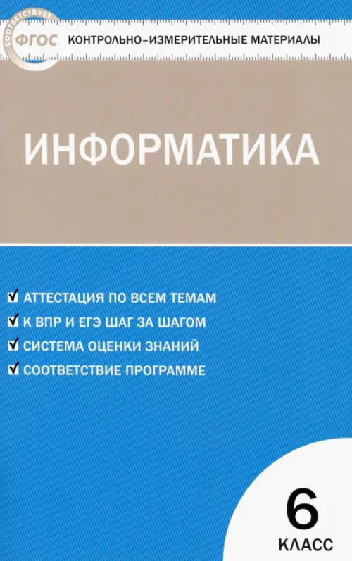 В пособии представлены контрольно-измерительные материалы (КИМы) по информатике для 6 класса. Издание составлено в соответствии с требованиями ФГОС. Структура КИМов аналогична структуре заданий ЕГЭ, что позволит постепенно подготовить учащихся к работе с подобным материалом. В конце издания предложены ответы к тестам.