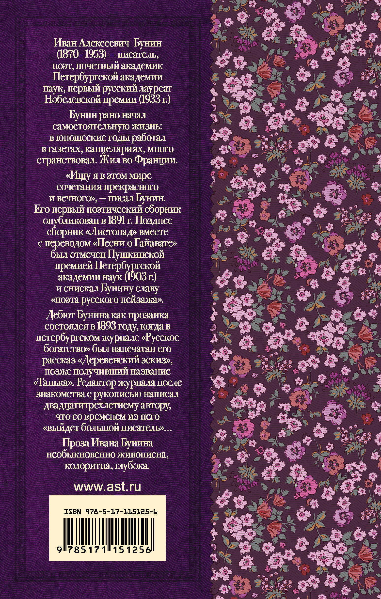 Иван Алексеевич Бунин (1870-1953) - писатель, поэт, почетный академик Петербургской Академии наук, первый русский лауреат Нобелевской премии (1933 г.) Бунин рано начал самостоятельную жизнь: в юношеские годы работал в газетах, канцеляриях, много странствовал. С 1920 г. жил во Франции. «Ищу я в этом мире сочетания прекрасного и вечного», - писал Бунин. Его первый поэтический сборник опубликован в 1891 г. Позднее сборник «Листопад» вместе с переводом «Песни о Гайавате» был отмечен Пушкинской премией Петербургской Академии наук (1903 г.) и снискал Бунину славу «поэта русского пейзажа». Дебют Бунина как прозаика состоялся в 1893 году, когда в петербургском журнале «Русское богатство» был напечатан его рассказ «Деревенский эскиз», позже получивший название «Танька». Редактор журнала после знакомства с рукописью написал двадцатитрёхлетнему автору, что со временем из него «выйдет большой писатель»… Проза И.А. Бунина необыкновенно живописна, колоритна, глубока. Бунин писал: «Нет никакой отдельной от нас природы, <�…> каждое движение воздуха есть движение нашей собственной жизни»… В книгу вошли рассказы и стихотворения И.А. Бунина, изучаемые в школе.