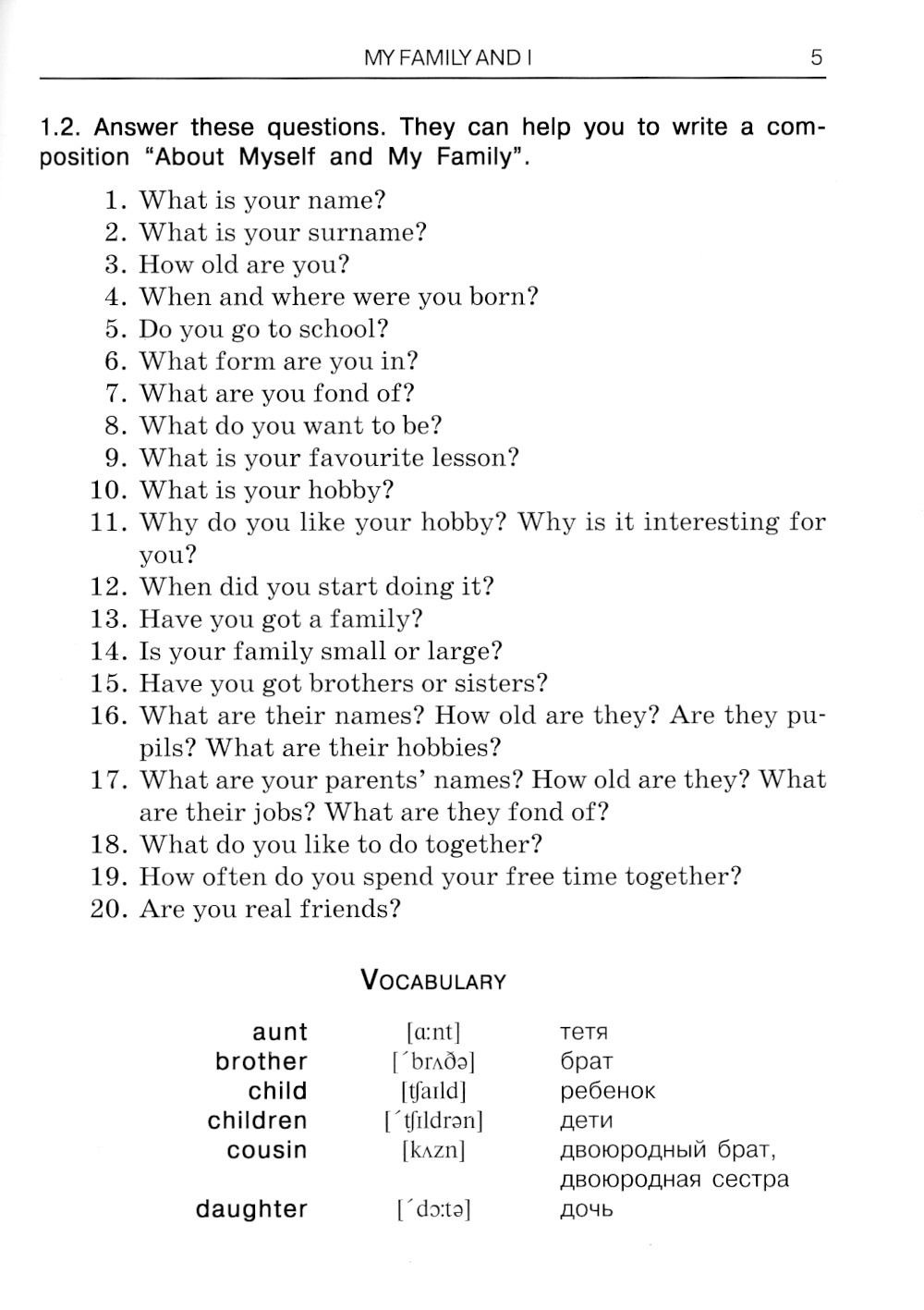 Пособие представляет собой сборник тем для учащихся средних школ. В сборнике рассматриваются такие темы, как "Му Family and I", "Daily Life", "My Friend", "School Life", "Favourite Animals", "Hobbies", "Seasons", "Travelling", "Moscow", "St. Petersburg", "London" и др. Тексты-рассказы, письма, написанные от лица российских и англоговорящих школьников, диалоги позволяют учащимся запомнить новые слова и выражения, подготовиться к устному ответу и написанию сочинения. С помощью упражнений к текстам и диалогам школьники закрепляют пройденный материал и учатся подробно отвечать на вопросы. Новая лексика представлена в словариках к упражнениям. Издательством подготовлена аудиозапись. Учителя могут использовать ее в качестве заданий на аудирование. Регулярное прослушивание аудиозаписи помогает детям совершенствовать произношение и учиться понимать живую английскую речь на слух.| Издательство | Каро |