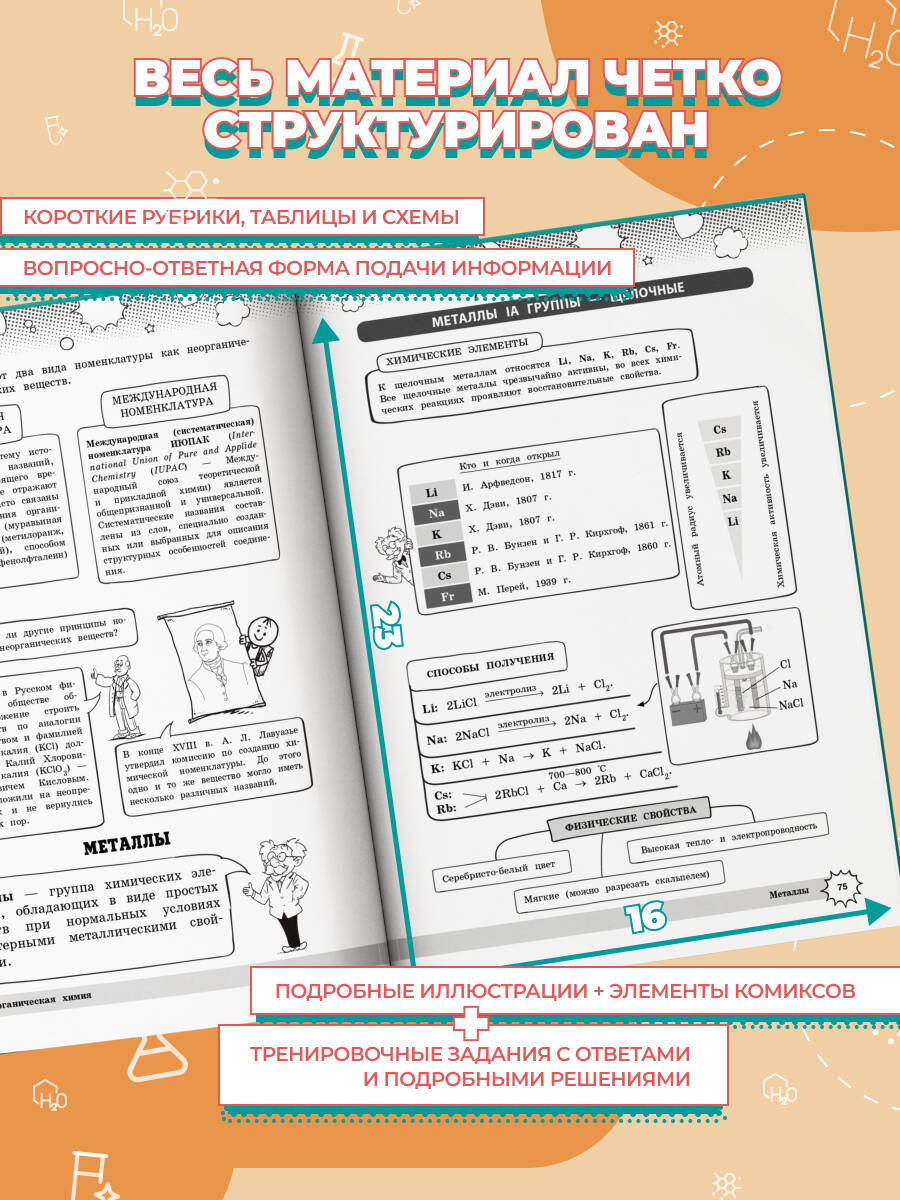Иллюстрированный справочник по химии станет незаменимым помощником школьника при подготовке к урокам, ОГЭ и ЕГЭ! Если вы путаетесь в химических реакциях, понятиях и не можете уложить в голове весь объёмный материал за школьный курс, то это пособие идеально вам подойдёт. В книге нет длинных и скучных текстов - весь материал разбит по коротким рубрикам, таблицам и схемам, которые дополняют иллюстрации. Важная информация подаётся через вопросно-ответную форму с элементами комиксов. Такая форма изложения теории сделает обучение не только эффективным, но и интересным. В книге представлены разделы «Первоначальные химические понятия», «Теоретические основы химии», «Неорганическая химия», «Органическая химия», «Условия протекания и признаки химических реакций», «Расчёты по химическим формулам и уравнениям реакций», «Методы познания в химии». Помимо этого, пособие содержит тренировочные задания с ответами и подробными решениями. Справочник станет отличным подарком ученикам средней и старшей школы, которые только начинают изучать химию или хотят углубить свои знания. Книга прослужит не один год благодаря интегральному переплёту и качественной полиграфии. Пособие будет полезно не только школьникам, но и учителям при составлении плана уроков, а также родителям, которые хотят освежить в памяти школьную программу.