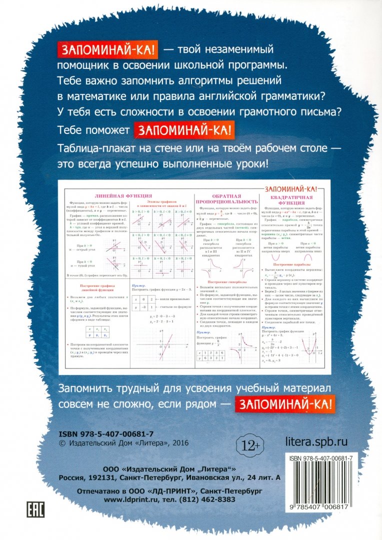Сложная тема в курсе алгебры "функции и построение их графиков" перестанет казаться такой сложной, когда перед глазами таблица со всей нужной информацией. Повесьте плакат над рабочим столом, если материал перед глазами, его легче запомнить. В таблице наглядно разобраны примеры построения графиков, что упростит школьнику процесс изучения этой темы. С серией таблиц "Запоминай-ка!" учиться легко и интересно.