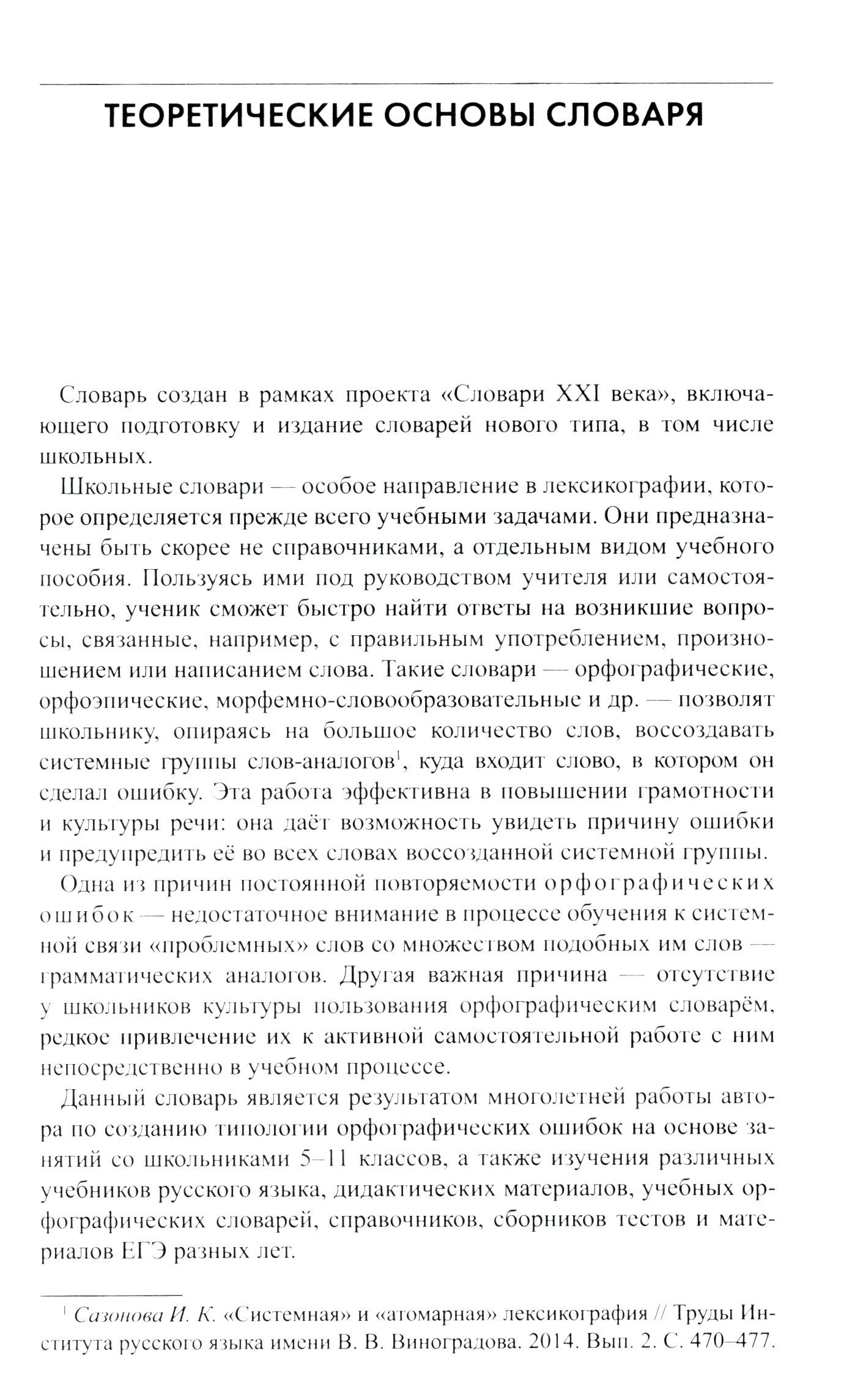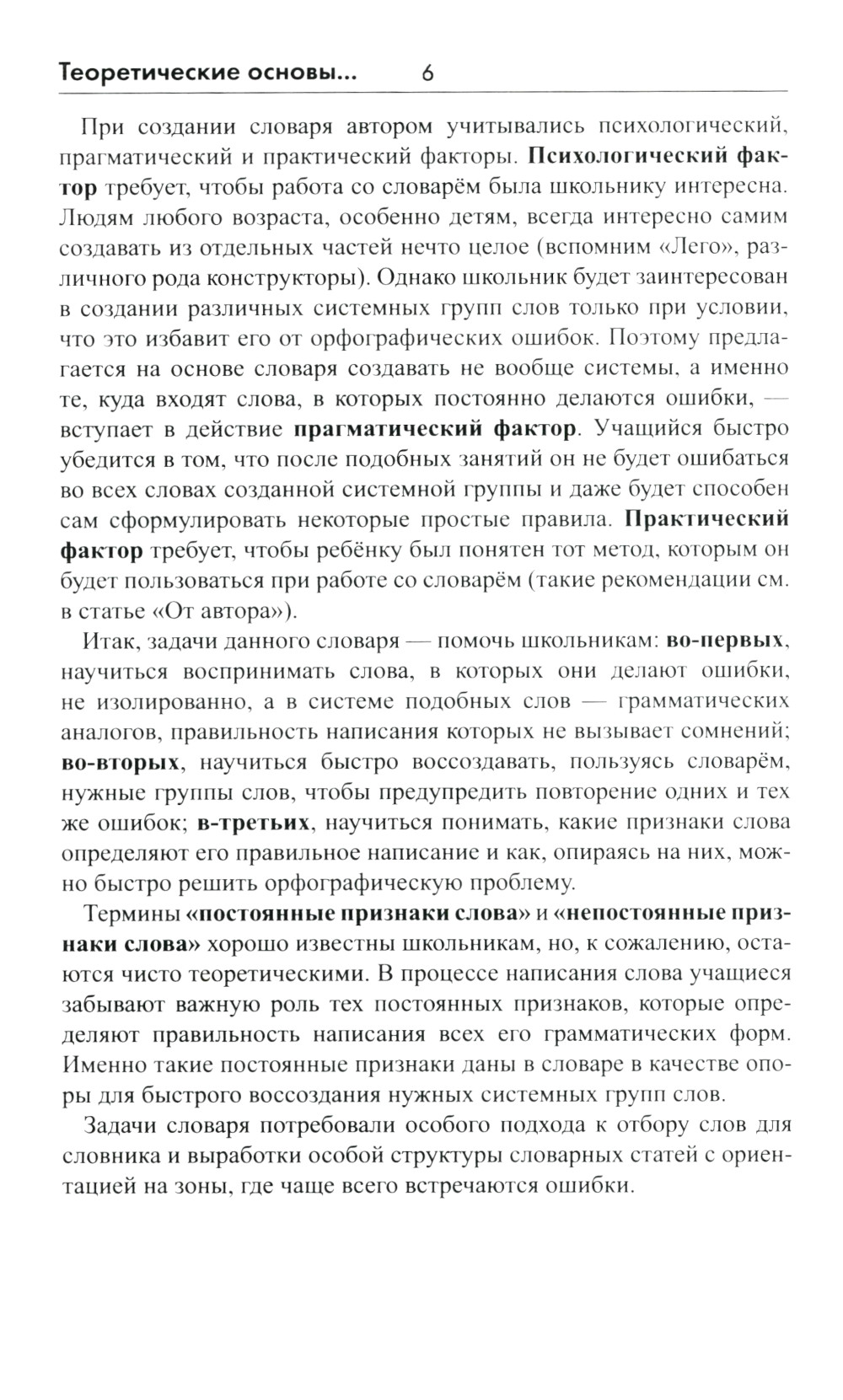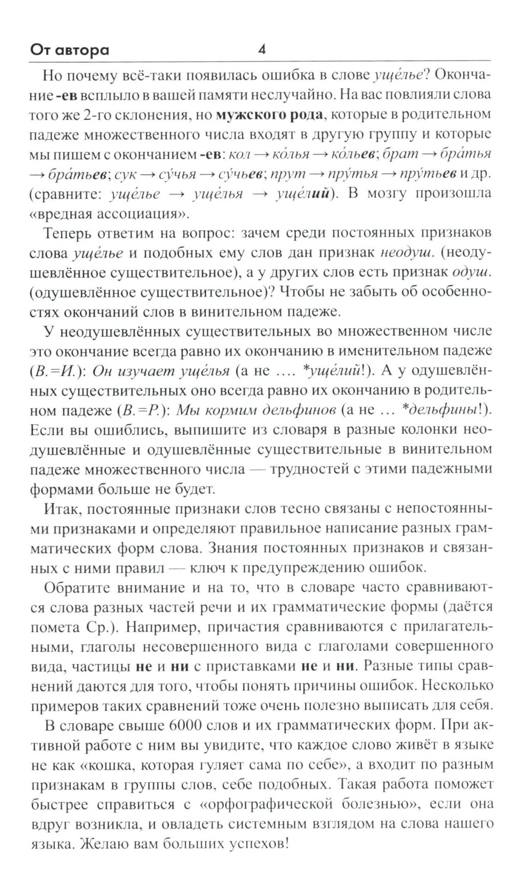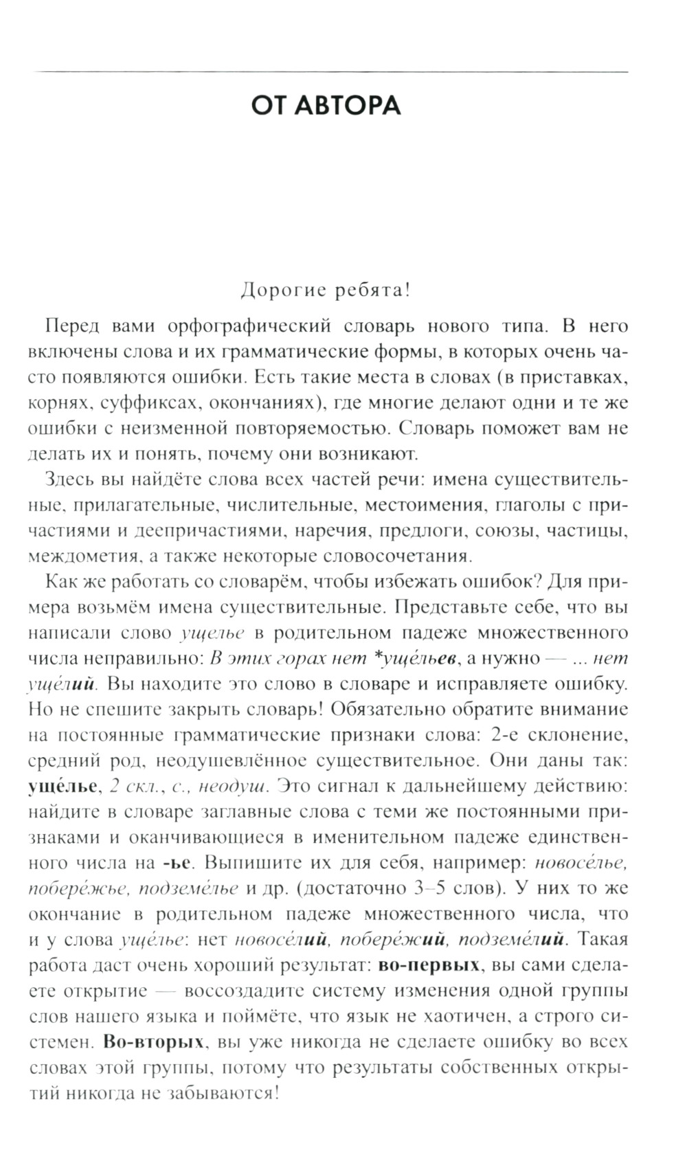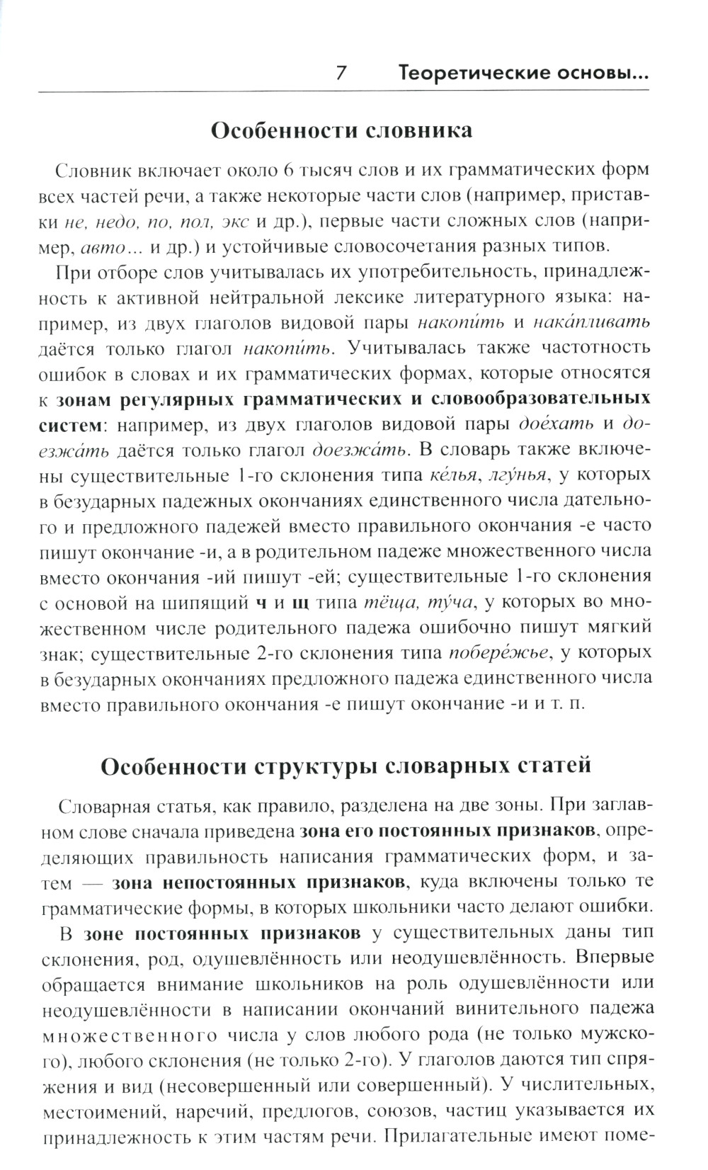 Словарь содержит свыше 6000 слов всех частей речи, в которых школьники очень часто делают ошибки. Словарь поможет школьнику понять причину этих ошибок, воспринимать слово не отдельно, а в группе слов, ему подобных, предотвратить повторение ошибок во всех словах такой группы. В словаре даются необходимые грамматические сведения, большое количество сравнений, сопоставлений слов и их грамматических форм, пояснений и примеров. Рекомендации написания слов определяются действующими правилами орфографии.