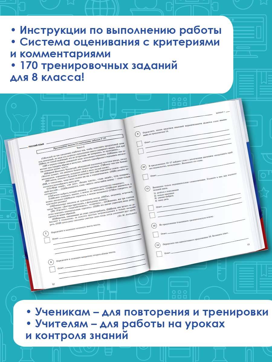 Пособие предназначено для подготовки учащихся 8 классов общеобразовательных организаций к Всероссийской проверочной работе по русскому языку. 10 тренировочных вариантов включают задания на проверку орфографической, орфоэпической, пунктуационной и языковой грамотности, умения работы с текстом, позволяющие оценить уровень индивидуальных достижений учащихся по предмету. В конце книги даны ответы на все задания и критерии оценивания их выполнения.
