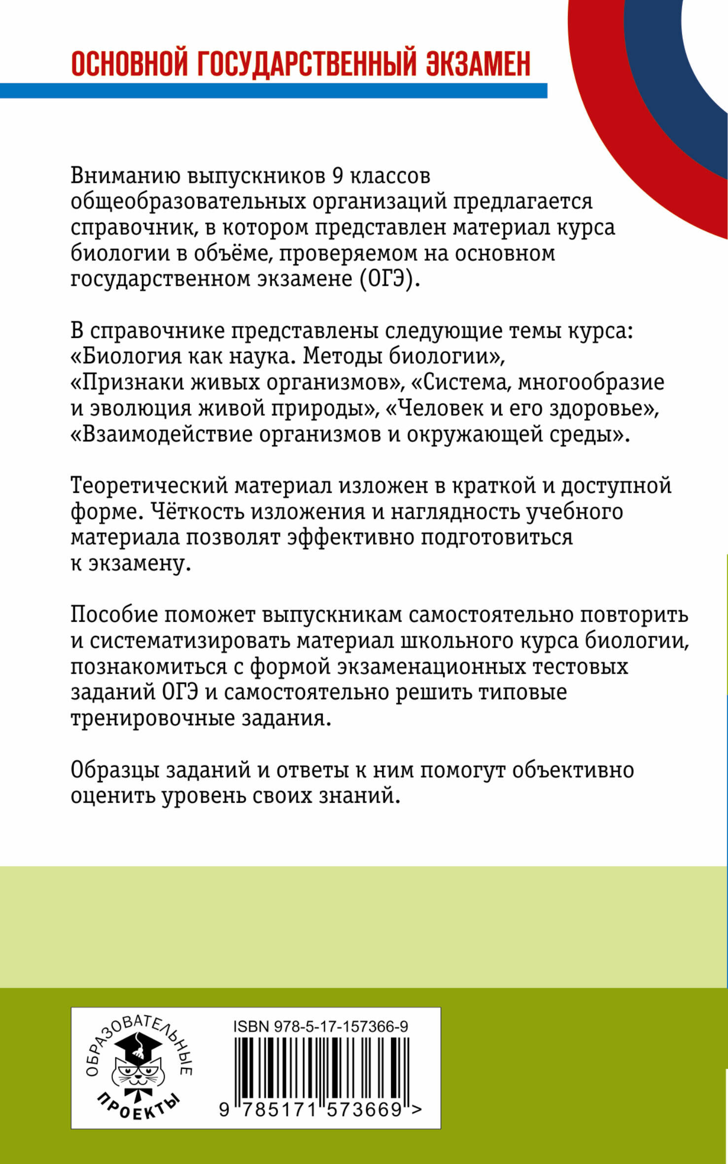 Справочник содержит весь теоретический материал по курсу биологии и тестовые задания, необходимые для подготовки к Государственной итоговой аттестации (ОГЭ) выпускников 9-х классов общеобразовательных учреждений. Теоретический материал изложен в краткой и доступной форме. Каждый раздел сопровождается примерами тестовых заданий, которые соответствуют формату ОГЭ. Они дают исчерпывающее представление о типах заданий экзаменационной работы и о степени их сложности. В конце пособия даны ответы на задания. Пособие может быть использовано учащимися для подготовки к ОГЭ и самоконтроля, а учителями - для подготовки учащихся основной школы к итоговой аттестации по биологии.| Издательство | ИЗДАТЕЛЬСТВО "АСТ" |